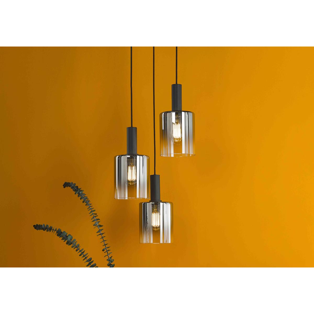 With an elegant modern design and 3 lights, this cluster pendant is a great choice for dining rooms and kitchens where you need to balance lighting with ambiance. Why you'll love it Contemporary design with a tasteful touch of glamour. Matt black metal work compliments the ombre smoked glass shades. Create a warm, inviting atmosphere with this impressive cluster pendant. What you need to know Made from steel and glass. Height is adjustable at the point of installation (33-150 cm). Takes 3 x ES GLS bulbs, max. 40. W. Dust with a soft, lint-free cloth. Dimmable when paired with suitable bulbs. Dimensions Height: 33-150 cm (13-59 inches) Width: 37 cm (15 inches) Depth: 37 cm (15 inches) Weight: 2.8 kg