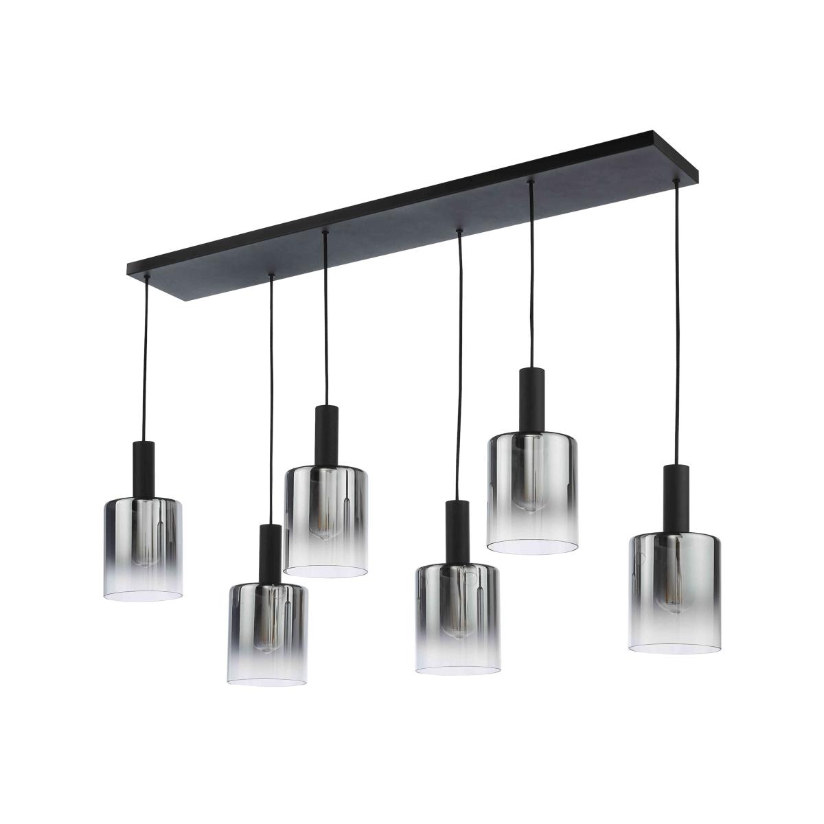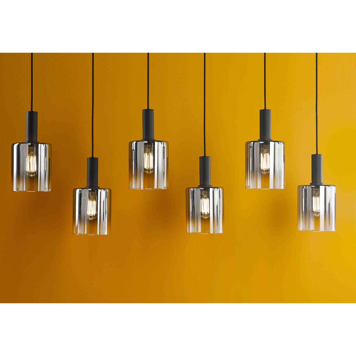 With plenty of lighting capability and bags of style, this bar pendant light is designed to illuminate larger spaces without compromising on looks. Why you'll love it Contemporary design with a tasteful touch of glamour. Matt black metal work compliments the ombre smoked glass shades. Great for lighting larger areas like kitchen islands or dining rooms. What you need to know Made from steel and glass. Height is adjustable at the point of installation (33-133 cm). Takes 6 x ES GLS bulbs, max. 40. W. Dust with a soft, lint-free cloth. Dimmable when paired with suitable bulbs. Dimensions Height: 33-133 cm (13-52 inches) Width: 126 cm (50 inches) Depth: 29 cm (12 inches) Weight: 7.2 kg