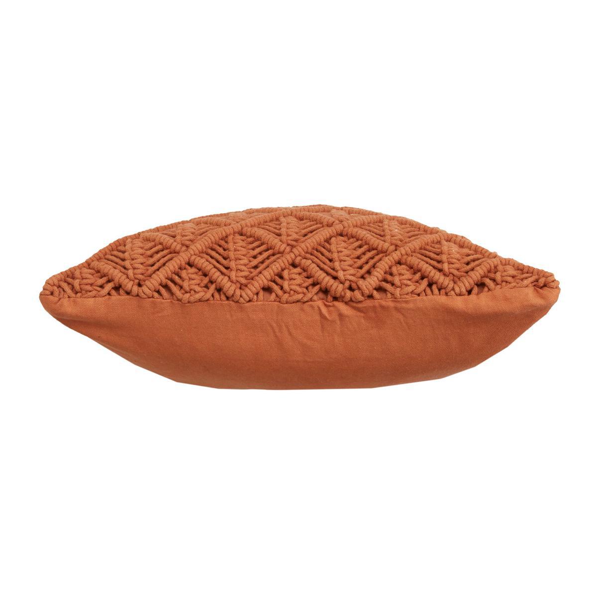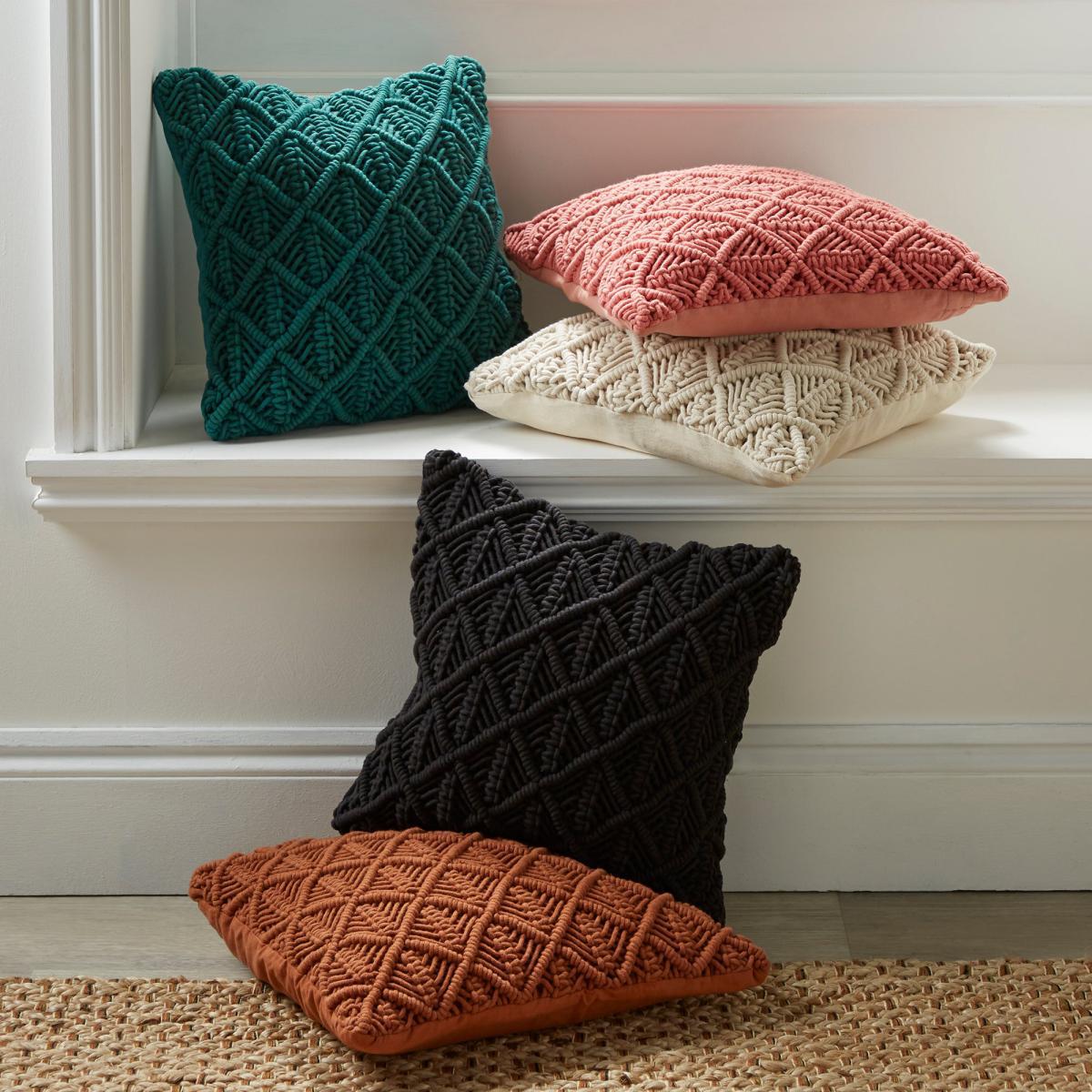 This beautiful woven cushion with a Macramé design has a plain cotton reverse and is filled with recycled polyester fibre fill. Made from 100% cotton, the cushion is available in other colours, so will therefore complement an array of home decors.