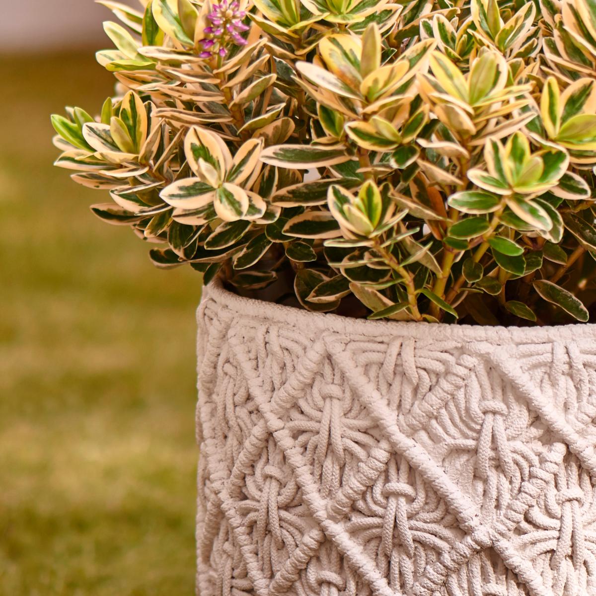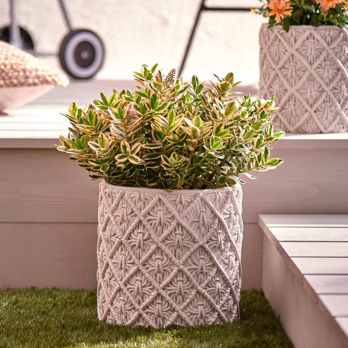 This large planter features an elegant macrame effect design that is perfect for making your garden look pretty this summer. With a waterproof cover, this planter has a drainage hole to help excess soil water to escape.