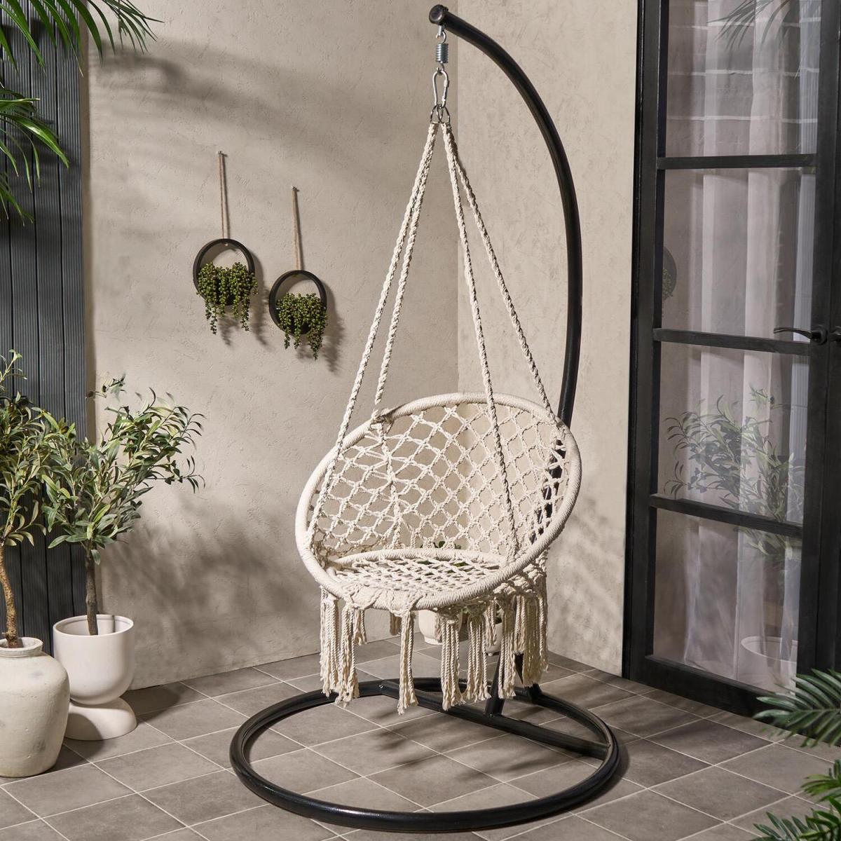 Relax in style and comfort with the Macrame Hanging Swing Chair. This beautifully crafted swing chair combines a chic macrame design with cosy cushioning, offering the perfect spot for reading, lounging, or simply unwinding. Made with durable materials for long-lasting use, its perfect for your garden, patio, or indoors. The included cushion adds extra comfort, making this hammock swing chair an inviting retreat in any space. Let the soothing sway take you to a place of ultimate relaxation. Macrame Hanging Swing Chair - Cream