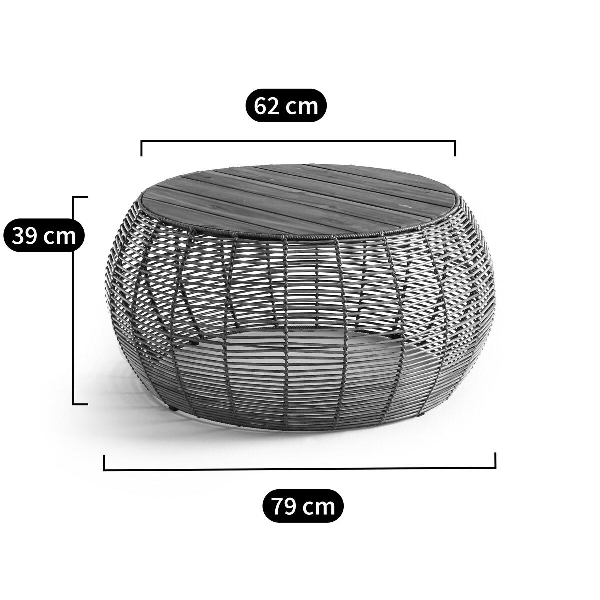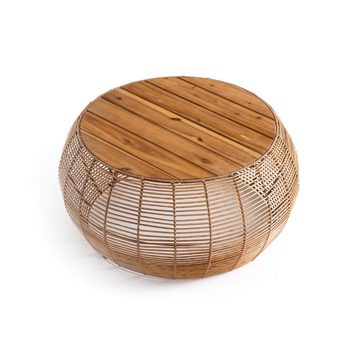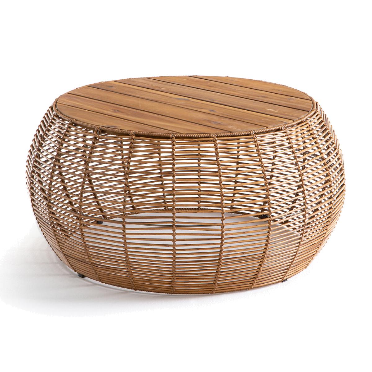 As pretty and practical outdoors as indoors, this coffee table will look great wherever you use it. Its large tabletop is perfect for serving drinks or food. The combination of acacia and woven resin will bring an exotic touch to your home or garden. Product Details • Round coffee table • Metal structure coated with woven resin imitation dark wood, epoxy finish • Top shelf in acacia slats with teak-tinted oil finish • Plastic pads on feet. Quality Info • The woven resin is resistant to bad weather, temperature variations and UV rays. Its lifespan will nevertheless depend on its exposure to UV rays, lunar rays and temperature variations. To maintain the braided resin, simply wash it with a soft sponge in soapy water. • Acacia is a wood that offers good mechanical properties (good resistance to insects and fungi) and is resistant to bad weather (alternation of dry and humid periods).Dimensions • Overall diameter : 79cm • Diameter of table top : 62cm • Total Height: 39cm • Table height: 2.7cmDelivery:. Sold pre-assembled. Available for home delivery. • WOOD FROM SUSTAINABLY MANAGED FORESTS. FSC® certified wood comes from forests that are environmentally, socially and economically well managed. Dimensions and weight of parcel • 1 parcel • L82 x H42 x D82cm. 8.7kg.