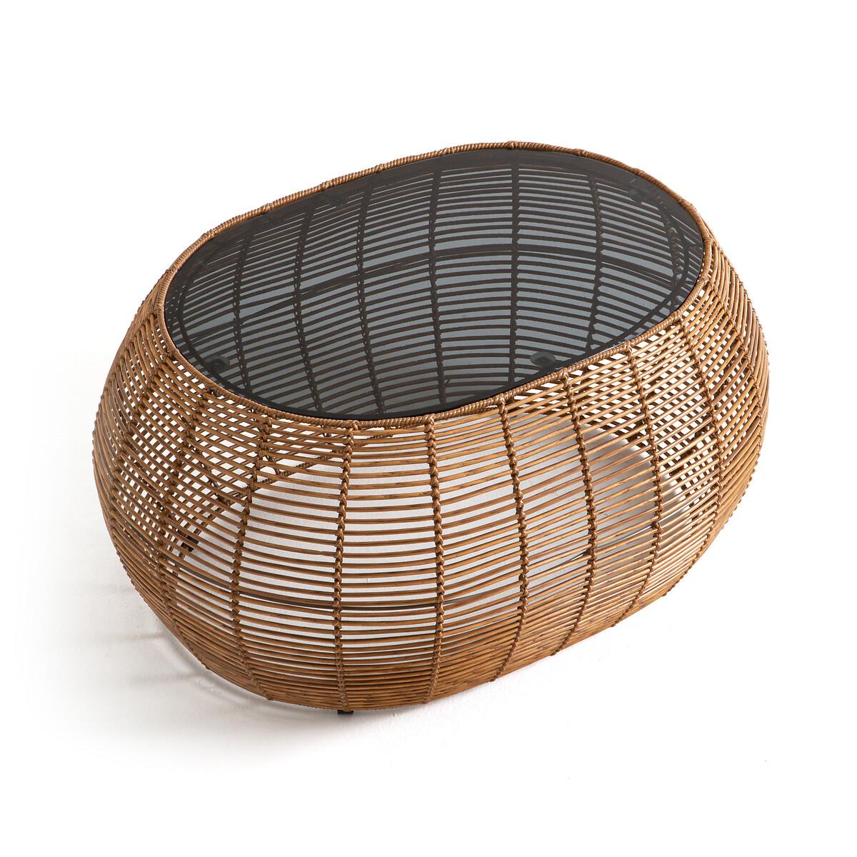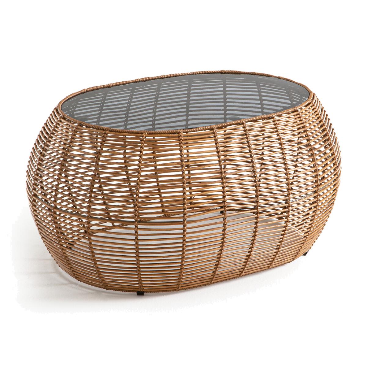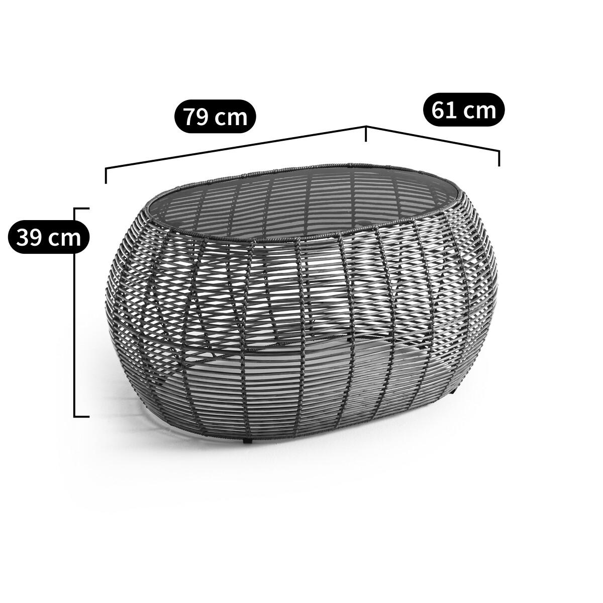 As pretty and practical outdoors as indoors, this coffee table will look great wherever you use it. Its large smoked glass tabletop is be perfect for serving drinks or food, and the woven resin will bring an exotic touch to your home or garden.. Product Details • Table basse ovale • Structure en métal revêtu de résine tressée imitation bois foncé, finition époxy • Plateau supérieur en verre fumé noir • Plastic pads on feet. Quality Info The resin is very resistant to weathering, temperature variations and UV rays. Its lifespan will nevertheless depend on its exposure to UV rays, lunar rays and temperature variations. To maintain the braided resin, simply wash it with a soft sponge in soapy water. Dimensions• Longueur totale :79cm• Largeur totale : 61cm. Height : 39cm• Longueur du plateau : 61.5cm• Largeur du plateau : 42.5cmDelivery:. Sold pre-assembled..Note! Please check that all access points are large enough to accommodate your delivery (doors, stairs, lifts).Dimensions and weight of parcel1 parcel: L82 x H42 x D63 cm. 8kg.