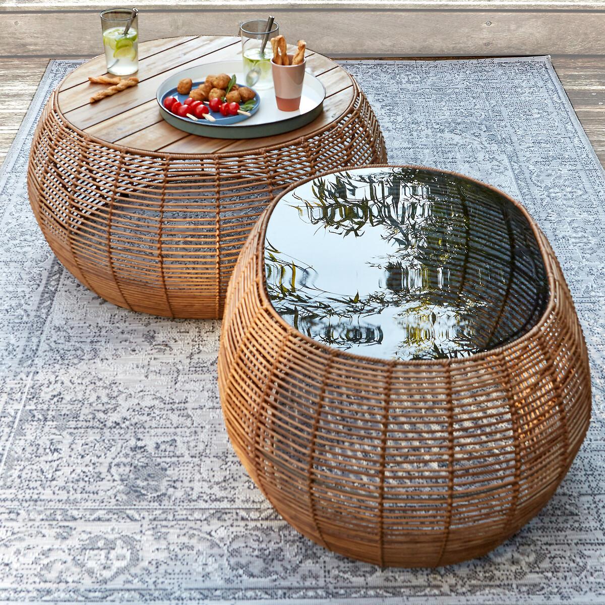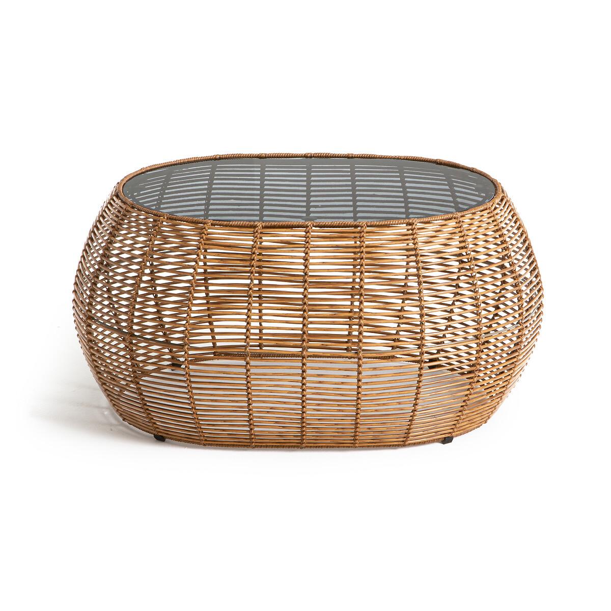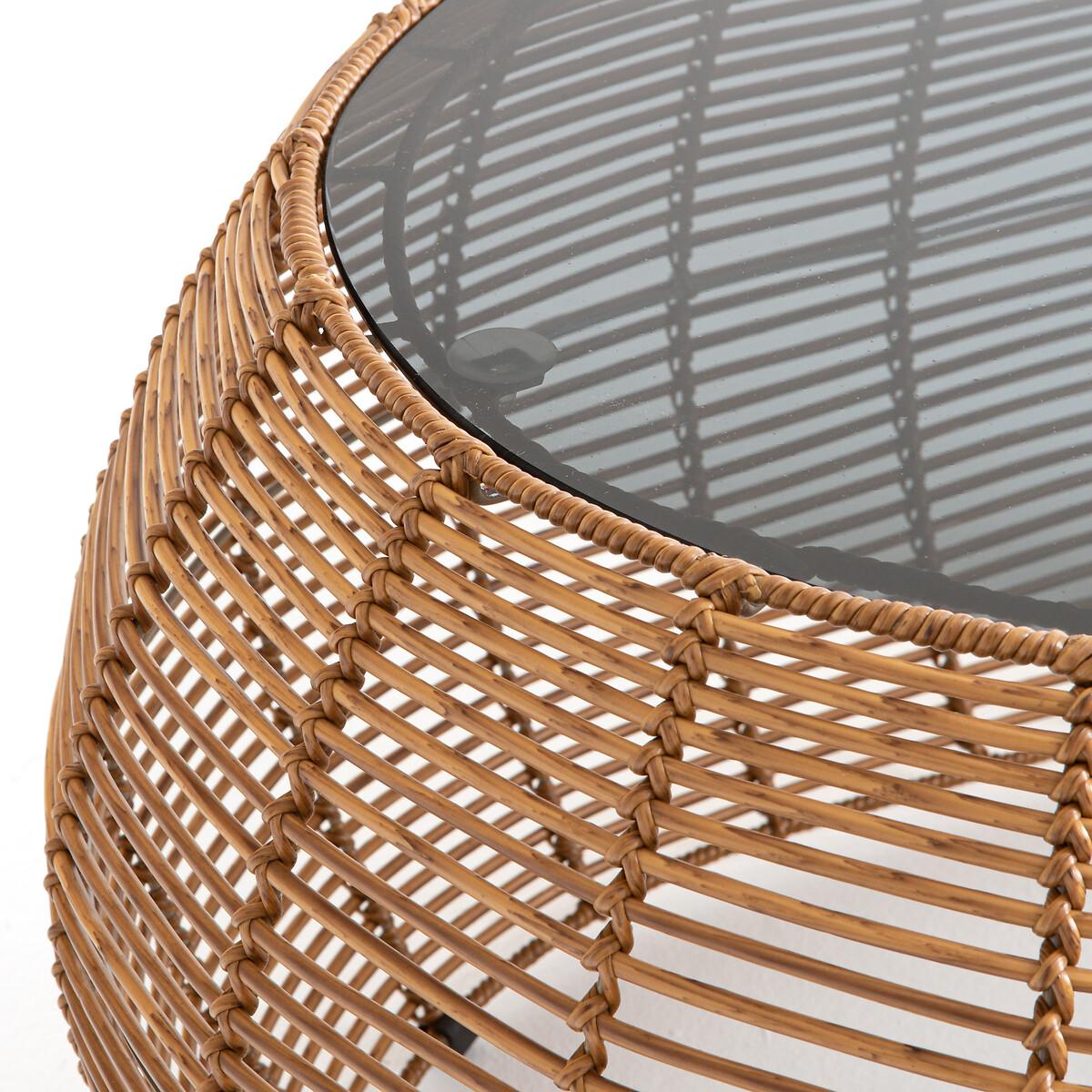 As pretty and practical outdoors as indoors, this coffee table will look great wherever you use it. Its large smoked glass tabletop is be perfect for serving drinks or food, and the woven resin will bring an exotic touch to your home or garden.. Product Details • Table basse ovale • Structure en métal revêtu de résine tressée imitation bois foncé, finition époxy • Plateau supérieur en verre fumé noir • Plastic pads on feet. Quality Info The resin is very resistant to weathering, temperature variations and UV rays. Its lifespan will nevertheless depend on its exposure to UV rays, lunar rays and temperature variations. To maintain the braided resin, simply wash it with a soft sponge in soapy water. Dimensions• Longueur totale :79cm• Largeur totale : 61cm. Height : 39cm• Longueur du plateau : 61.5cm• Largeur du plateau : 42.5cmDelivery:. Sold pre-assembled..Note! Please check that all access points are large enough to accommodate your delivery (doors, stairs, lifts).Dimensions and weight of parcel1 parcel: L82 x H42 x D63 cm. 8kg.