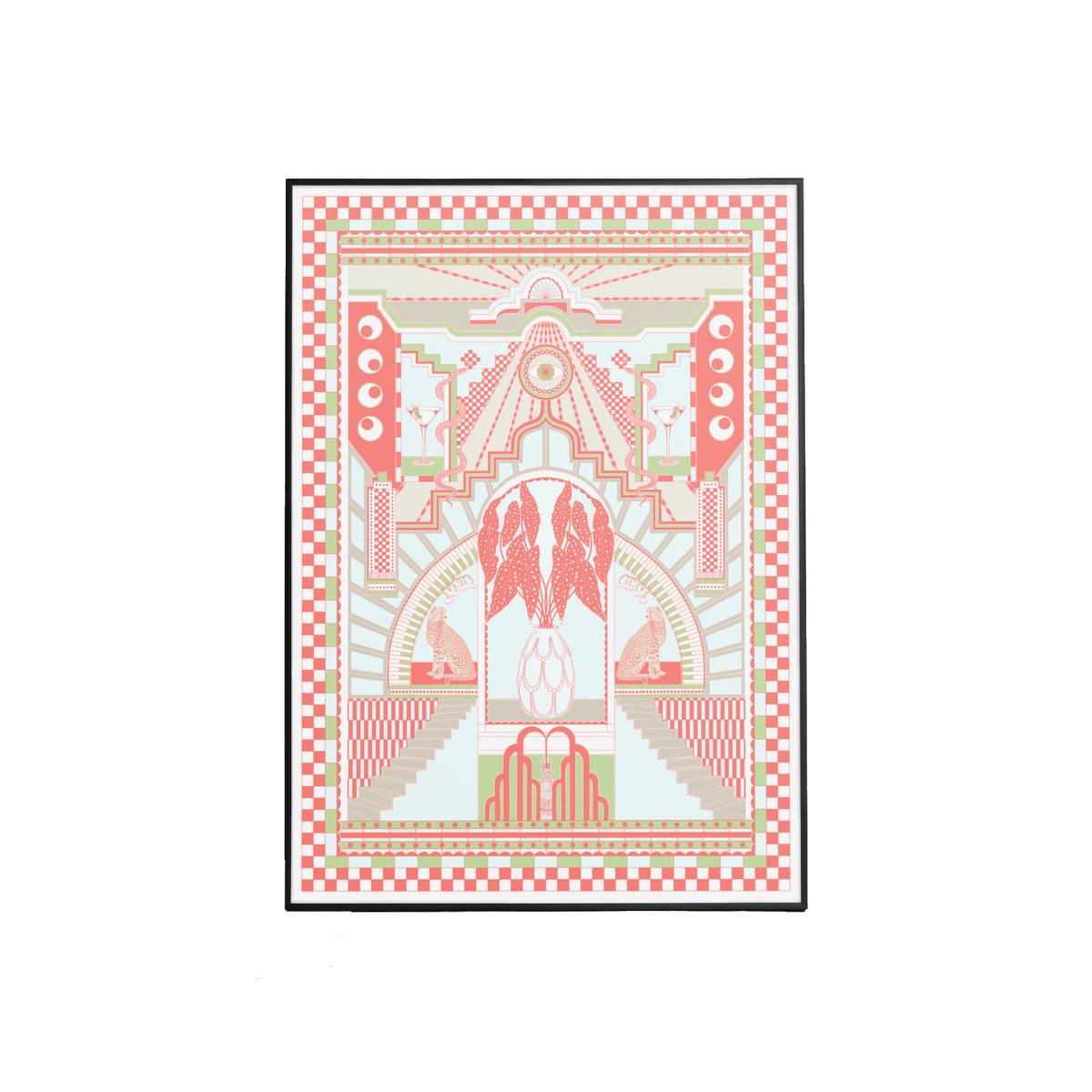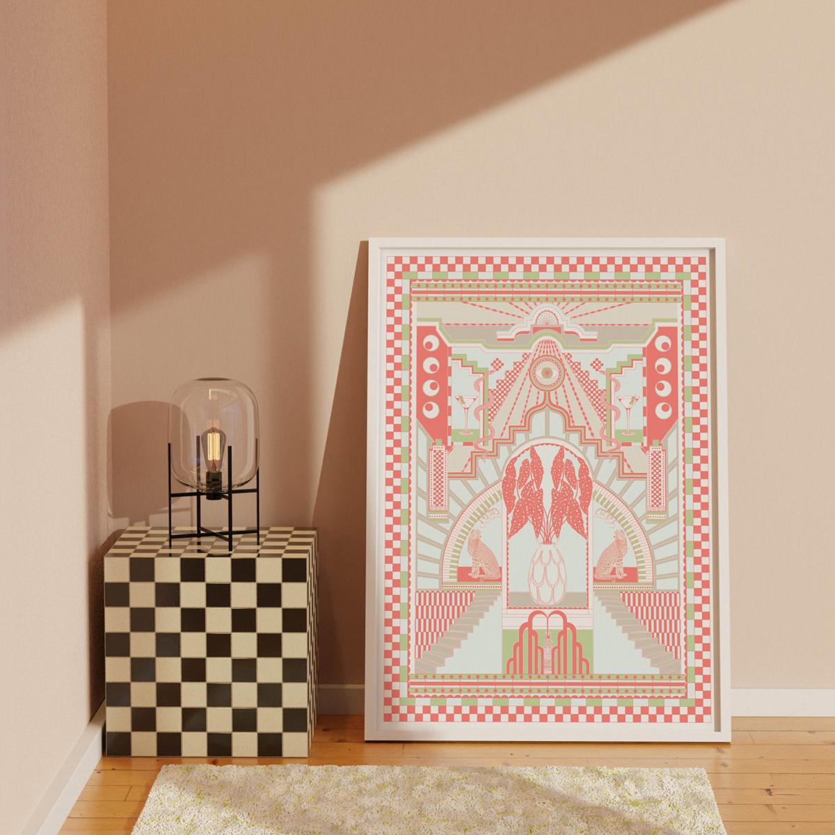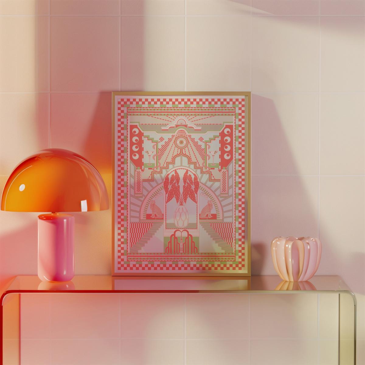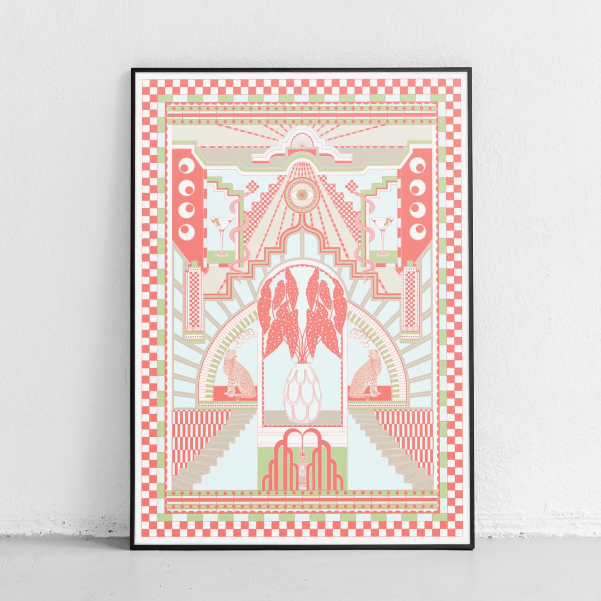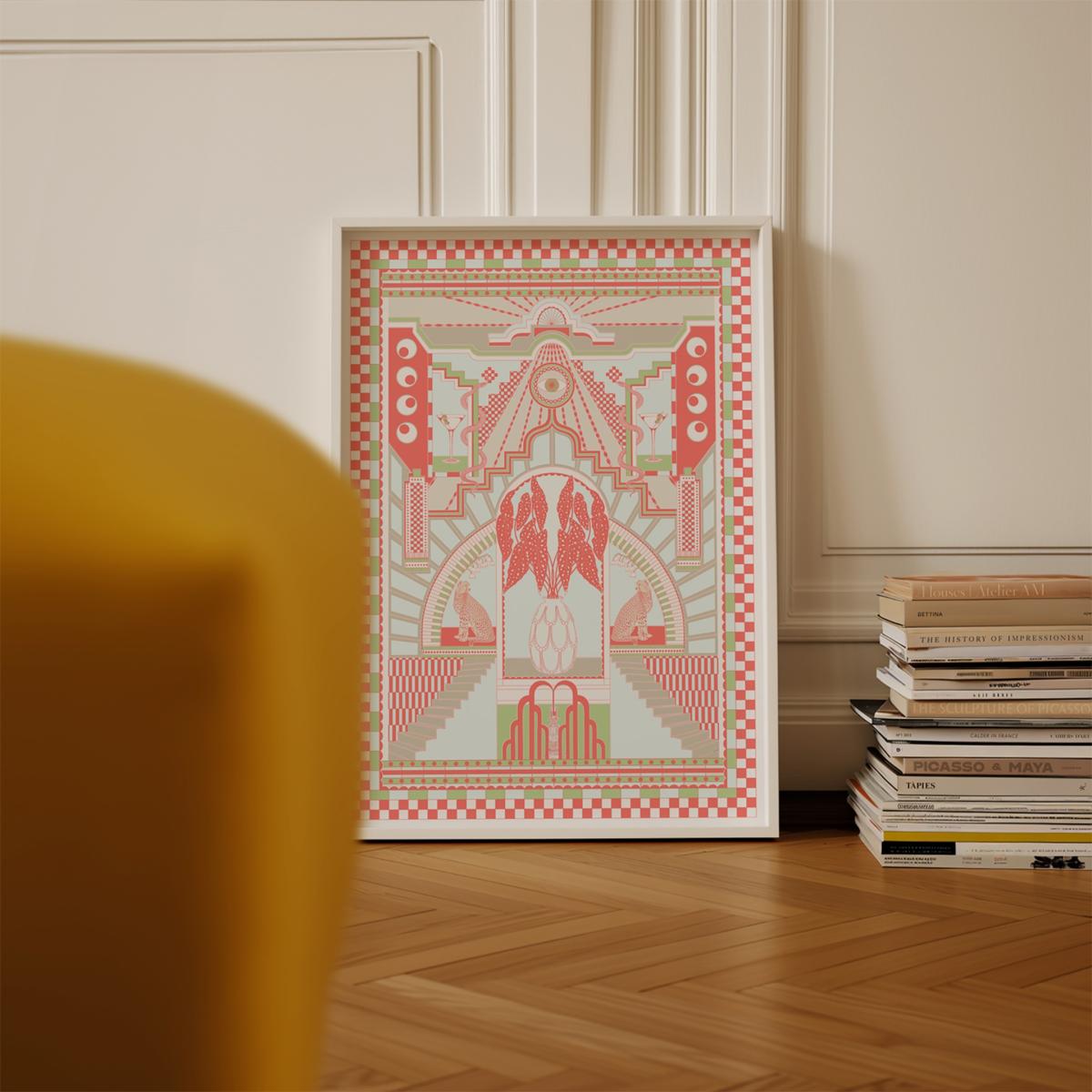 Signed Giclee fine art print illustrated by Abi Overland. This art deco era architecturally inspired piece was created from listening to a ridiculous number of whimsical fantasy books and creating a fun little world combining modern and joyful colour schemes with classical architectural styles. All prints come unframed