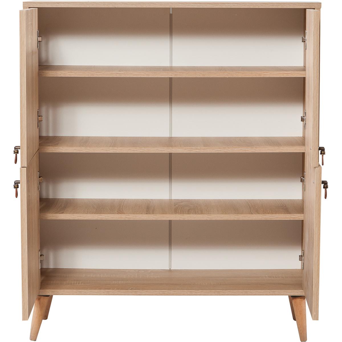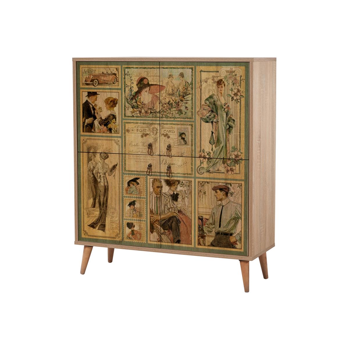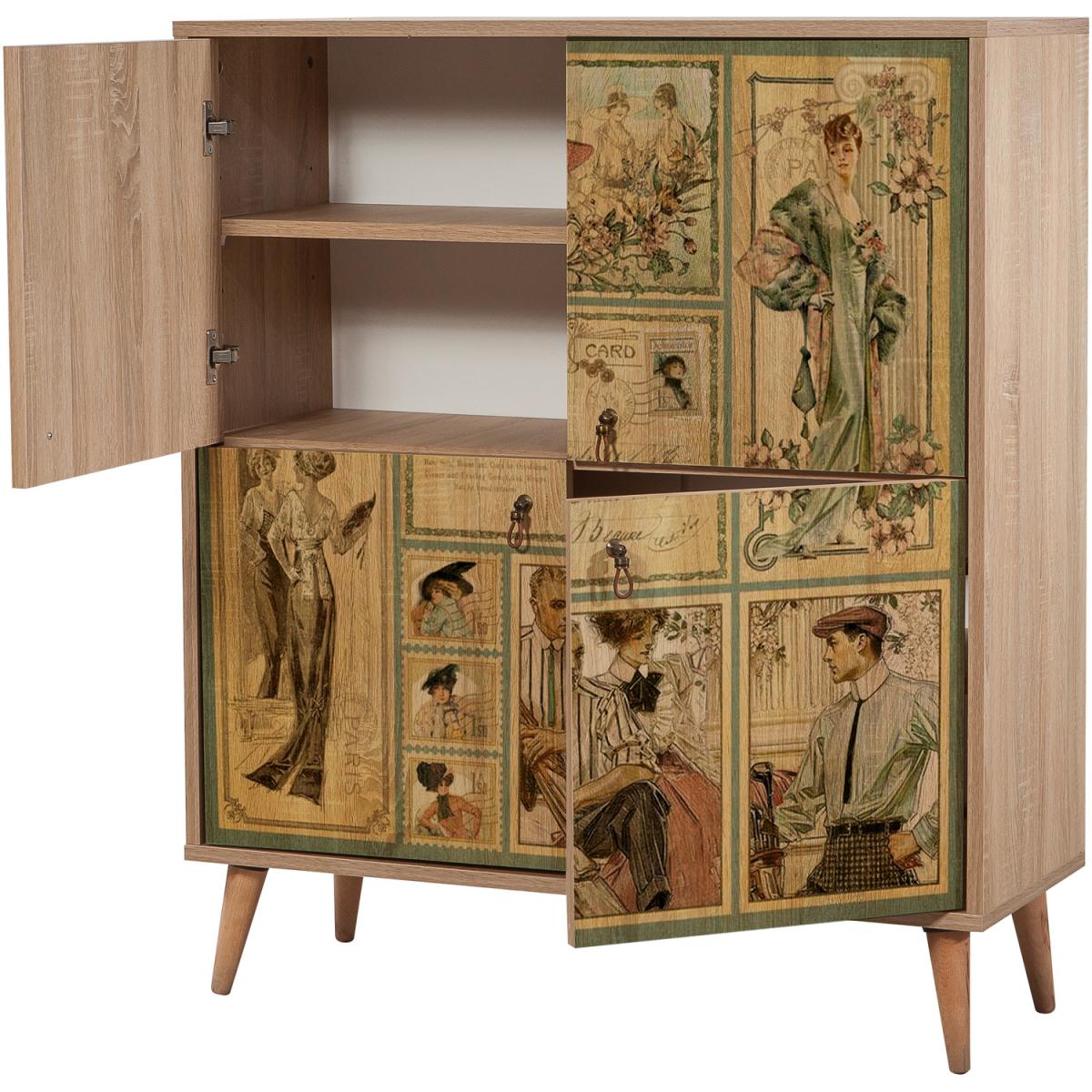 This sideboard has an elegant and functional design. It has 4 doors and 4 shelves that offer an ample amount of storage space for your needs. The doors have a madame-themed design made using an ultraviolet digital printing technique. This technique increases the durability of the pattern against scratches and fading.