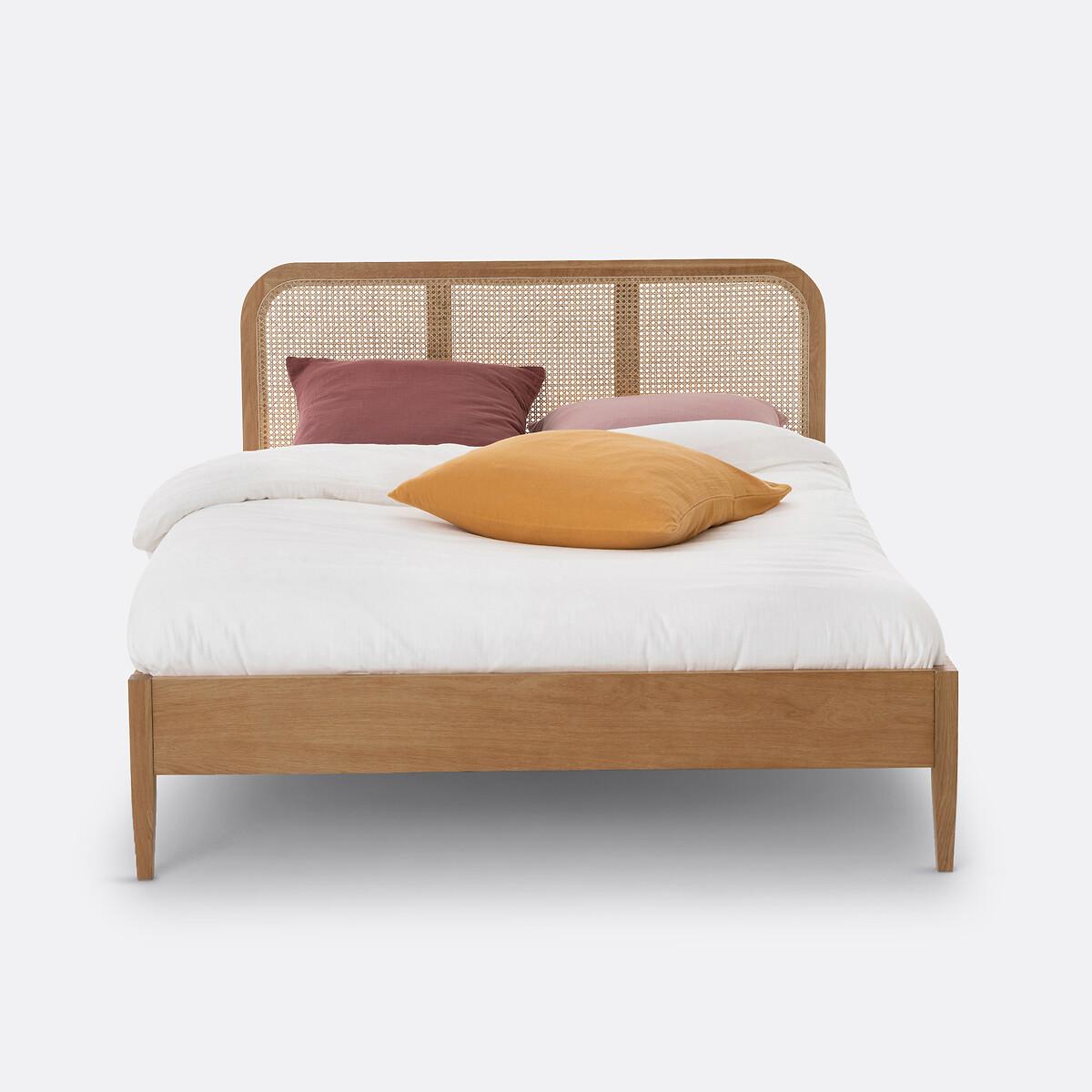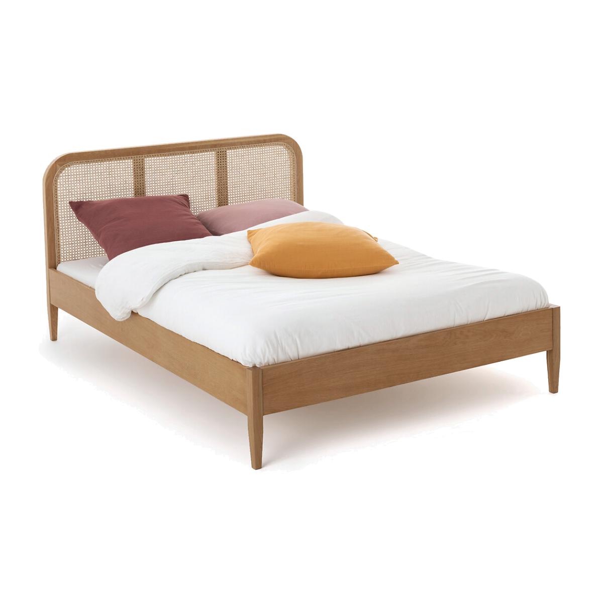 Be seduced by its curves and trendy vintage spirit. The Madara bed brings a chic and natural touch to your bedroom. Product Details • Oak veneered MDF, solid oak legs, nitrocellulose varnish finish. • Headboard in oak and rattan cane. • Solid pine reinforcement bars • Supplied with plywood slatted baseDimensionsTotal. Sleeping area Double (140 x 190cm) • Width: 144.5cm • Height: 91cm • Length: 198.5cm. Sleeping area (King) 160 x 200cm • Width: 164.5cm • Height: 91cm • Length: 208.5cm Sleeping area (Super King) 180 x 200cm • Width: 184.5cm • Height: 91cm • Length: 208.5cm Usable dimensions • Height available under the long side: 19cm • This product requires assembly. Dimensions and weight of package:2 parcels. Double size • L152 x H99 x D11cm. 28.2kg • L197 x H23 x D12cm. 13.5kg. King size • L172 x H99 x D11cm. 31.5kg • L207 x H23 x D12cm. 14kg Super King size • L192 x H101 x D12cm. 33.5kg • L209 x H25.5 x D12cm. 14.6kg