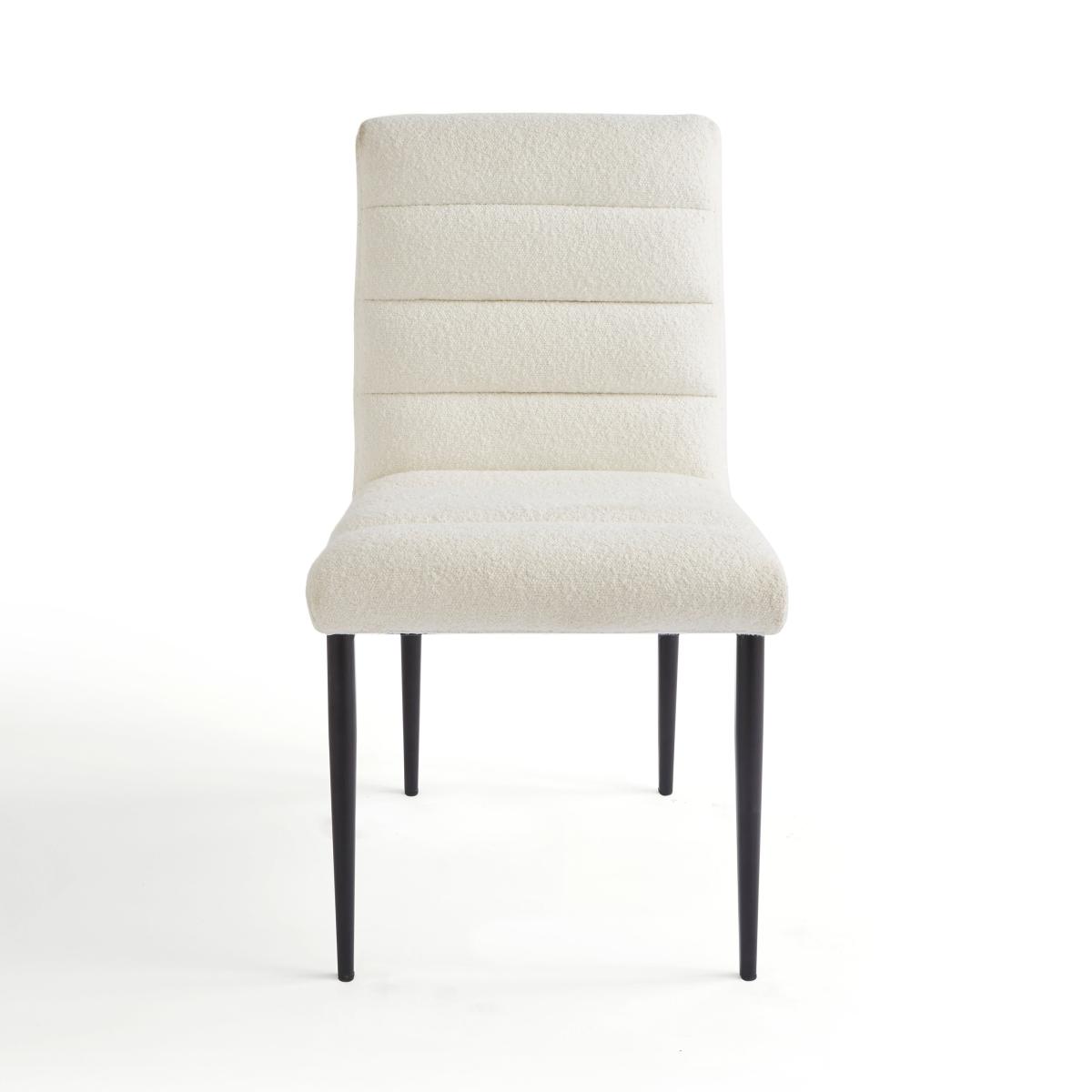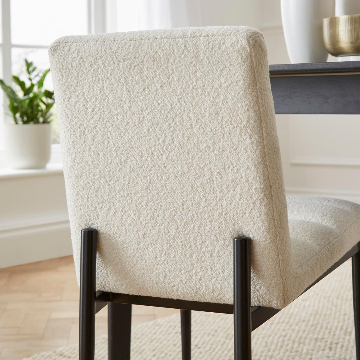 * Upholstered chair* High back* Foam filled seat This dining chair, upholstered in a modern ivory boucle is designed to enhance your dining experience with its sophisticated look and plush seating. The soft boucle upholstery of this chair combines comfort and style with its elegant design. Its sturdy construction ensures durability, making it a practical choice for any home.