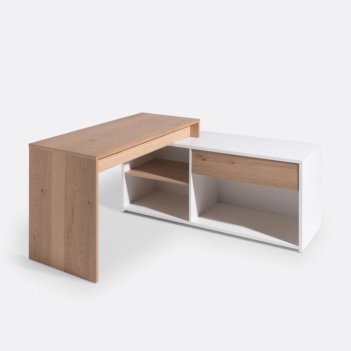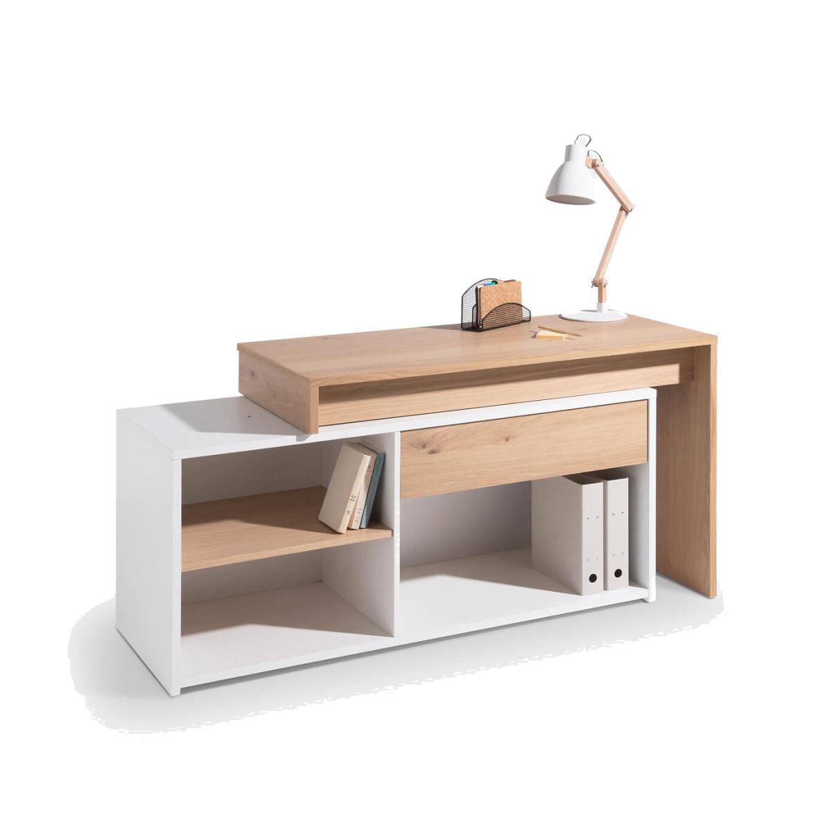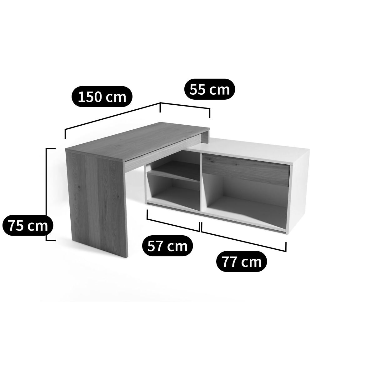 The modular Maddo corner desk adapts to all situations thanks to its 3 possible positions. The box, fitted with a drawer and 3 storage niches, is positioned under the desk or at an angle on the side. Ideal for making the most of your space. Made in Europe. Product Details • 1 large drawer • 1 large compartment under the drawer • 2 small compartments • Functional storage capacity. • White lacquered melamine cabinet and partition. • Top, shelf and drawer front in oak veneered particle board, acrylic varnish finish. Dimensions. Total: • L150cm • H75cm • Depth 55cm. Usable dimensions: • Drawer: 72 x 39 x 13 cm. • Large compartment : 77 x 47.4 x 35.5 cm. • Small Compartment: 57 x 47 x 26 cm. Delivery:This product requires assembly. Available for home delivery. Note! Please check that access points (doorways, stairways, lifts) are wide enough to accommodate your delivery. • Made in Europe. Dimensions and weight of parcel:2 parcels145 x 63.5 x 11 cm, 35.4 kg. • 149 x 58.5 x 13 cm, 38 kg.