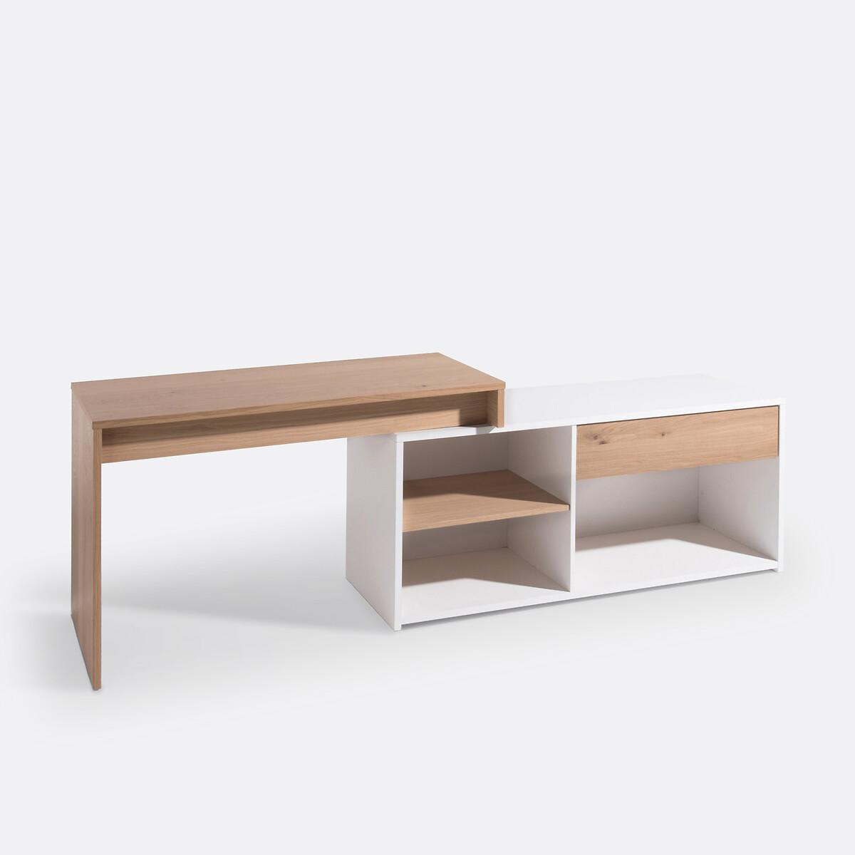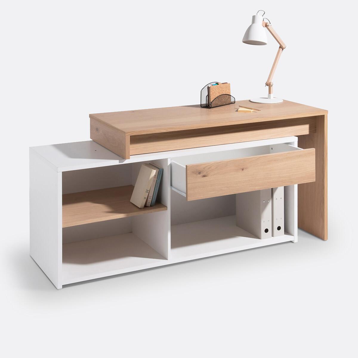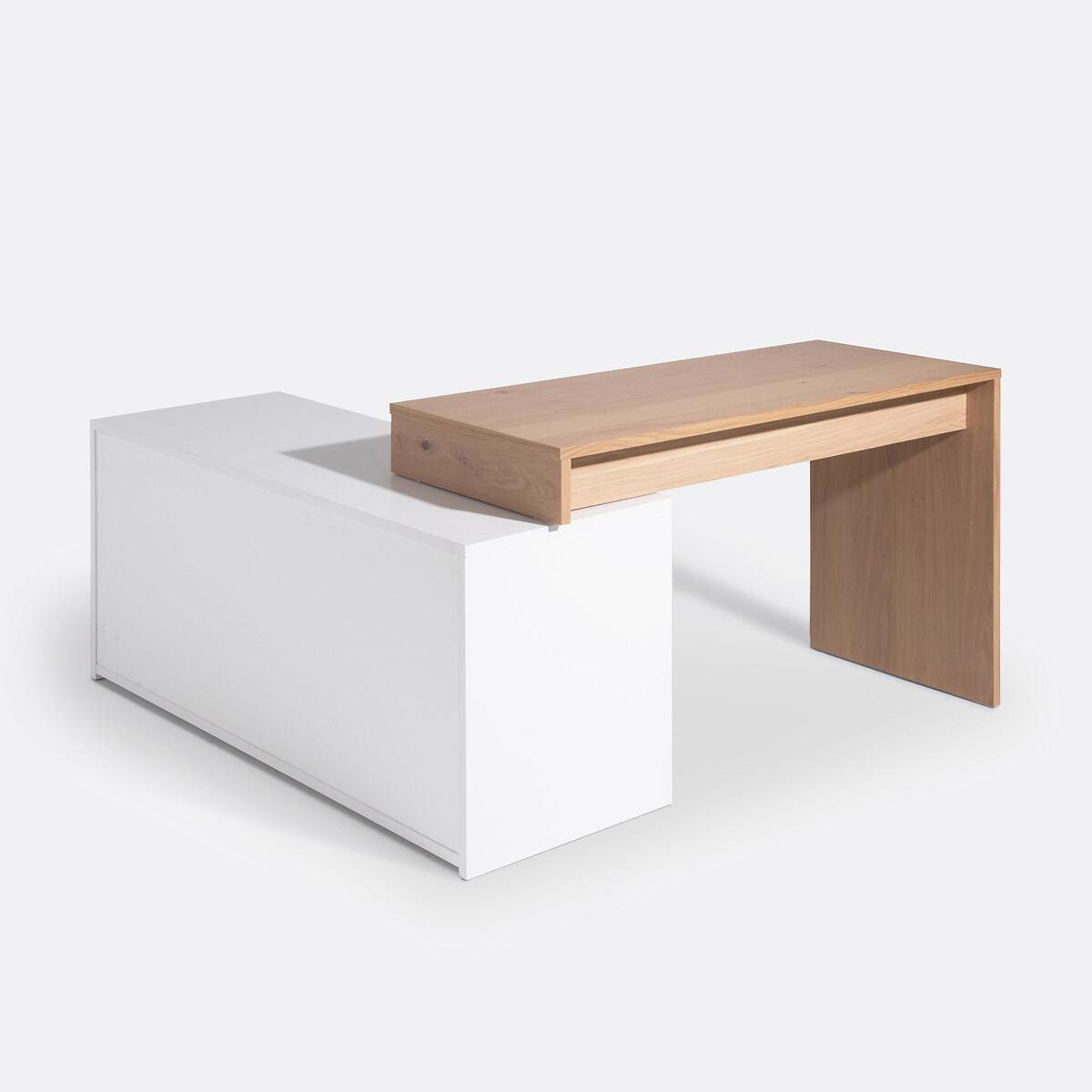 The modular Maddo corner desk adapts to all situations thanks to its 3 possible positions. The box, fitted with a drawer and 3 storage niches, is positioned under the desk or at an angle on the side. Ideal for making the most of your space. Made in Europe. Product Details • 1 large drawer • 1 large compartment under the drawer • 2 small compartments • Functional storage capacity. • White lacquered melamine cabinet and partition. • Top, shelf and drawer front in oak veneered particle board, acrylic varnish finish. Dimensions. Total: • L150cm • H75cm • Depth 55cm. Usable dimensions: • Drawer: 72 x 39 x 13 cm. • Large compartment : 77 x 47.4 x 35.5 cm. • Small Compartment: 57 x 47 x 26 cm. Delivery:This product requires assembly. Available for home delivery. Note! Please check that access points (doorways, stairways, lifts) are wide enough to accommodate your delivery. • Made in Europe. Dimensions and weight of parcel:2 parcels145 x 63.5 x 11 cm, 35.4 kg. • 149 x 58.5 x 13 cm, 38 kg.