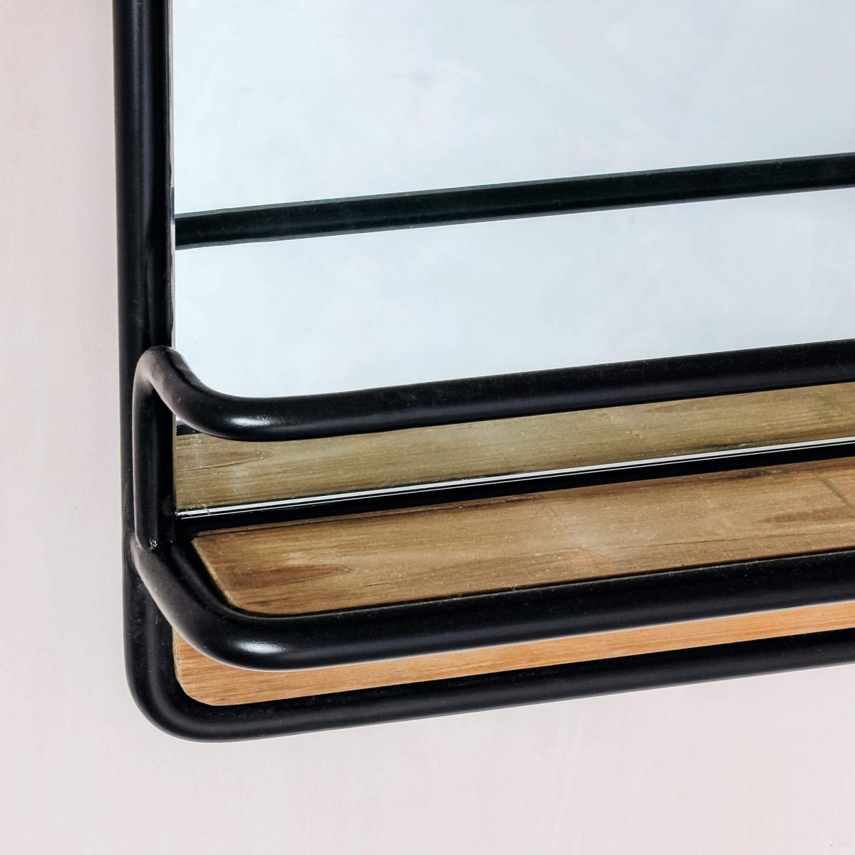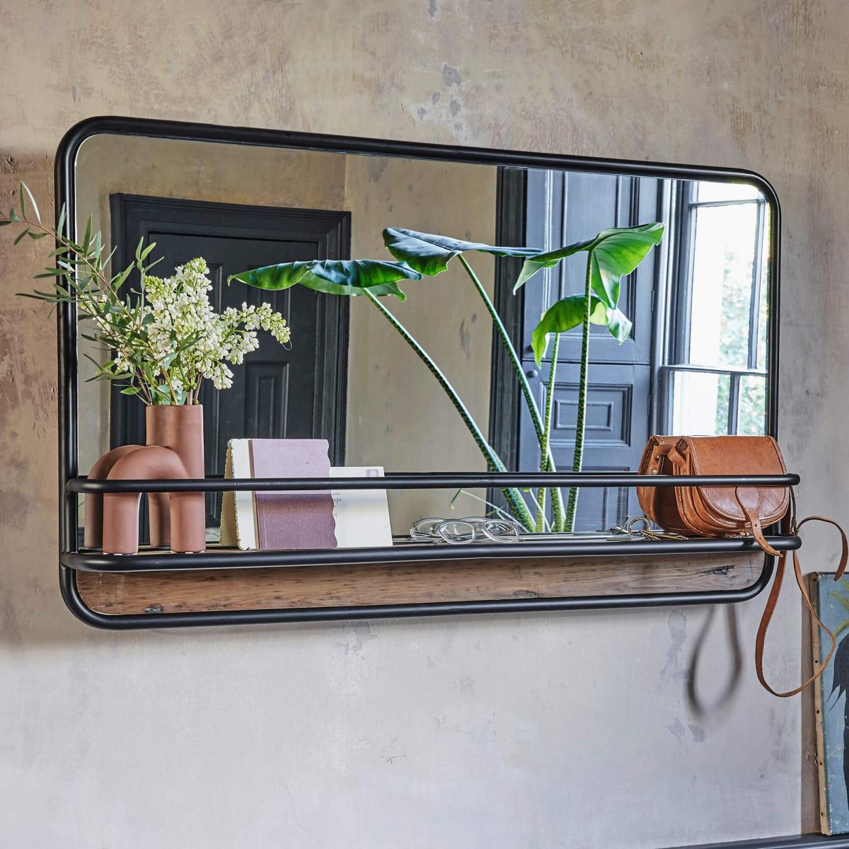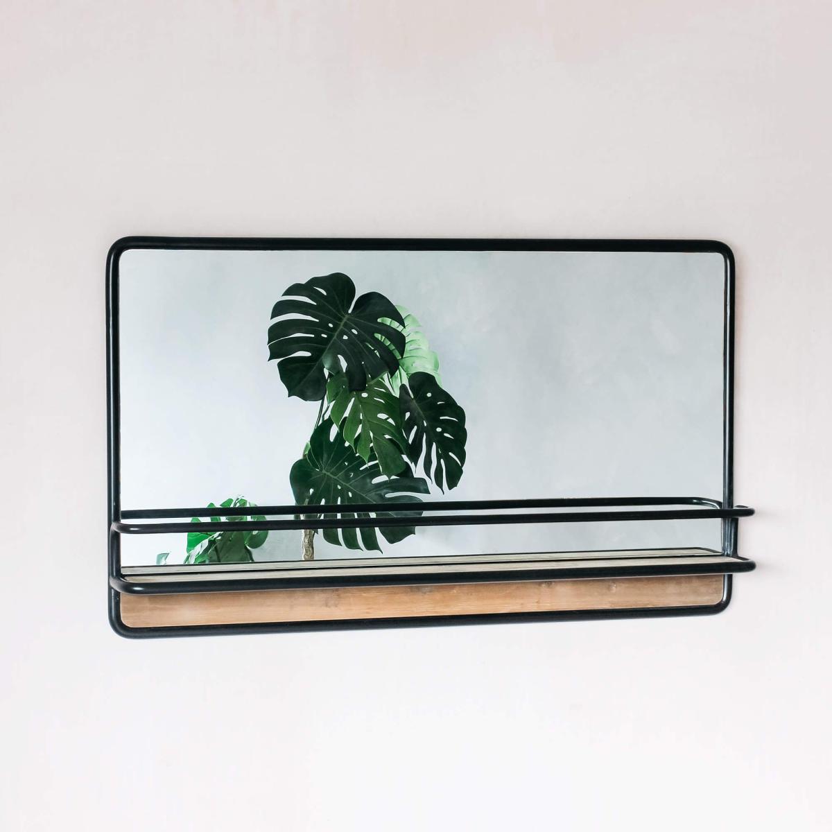 A sleek landscape mirror crafted from a black metal rectangle with curved edges and a handy shelf.