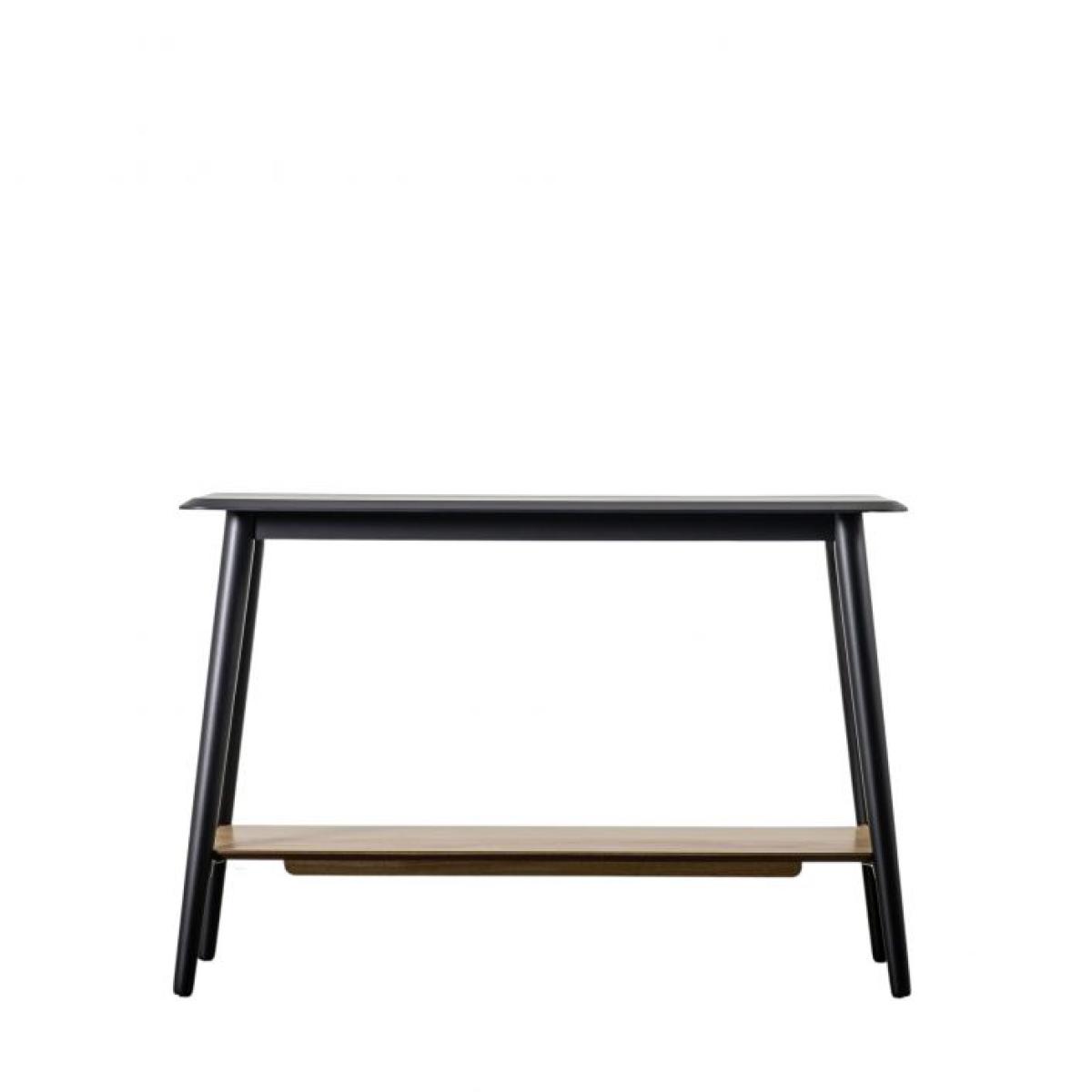 Offering a modern twist on mid-century style, this lovely console table features solid timber legs in a black finish paired with a black oak veneer top and a natural oak veneer shelf to add contrast for a more contemporary look. It is part of a collection offering a range of elegant living and dining tables. They are designed for easy delivery to any room in any property, whilst reducing the packaging needed. Easy assembly is required, but all the tools needed are supplied.
