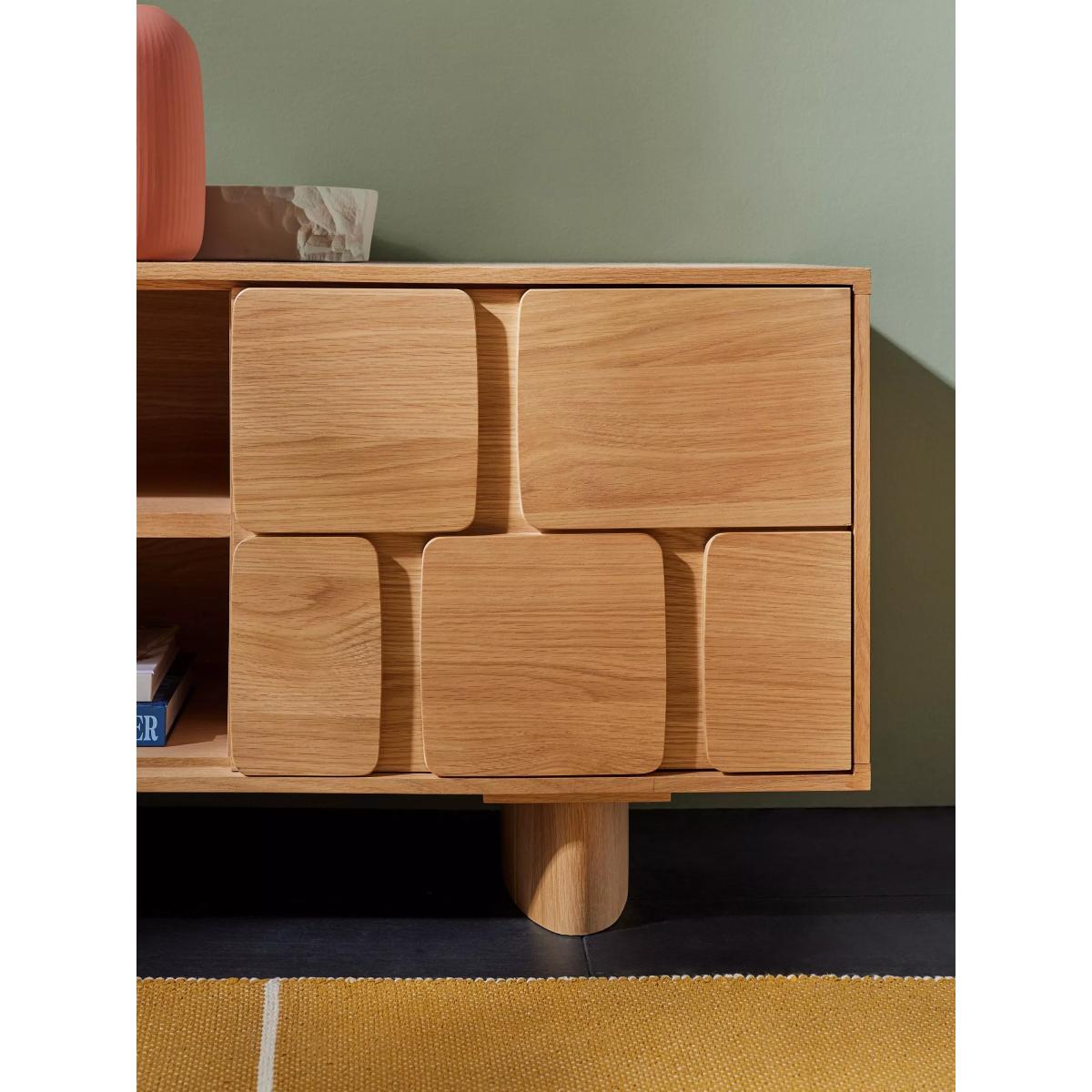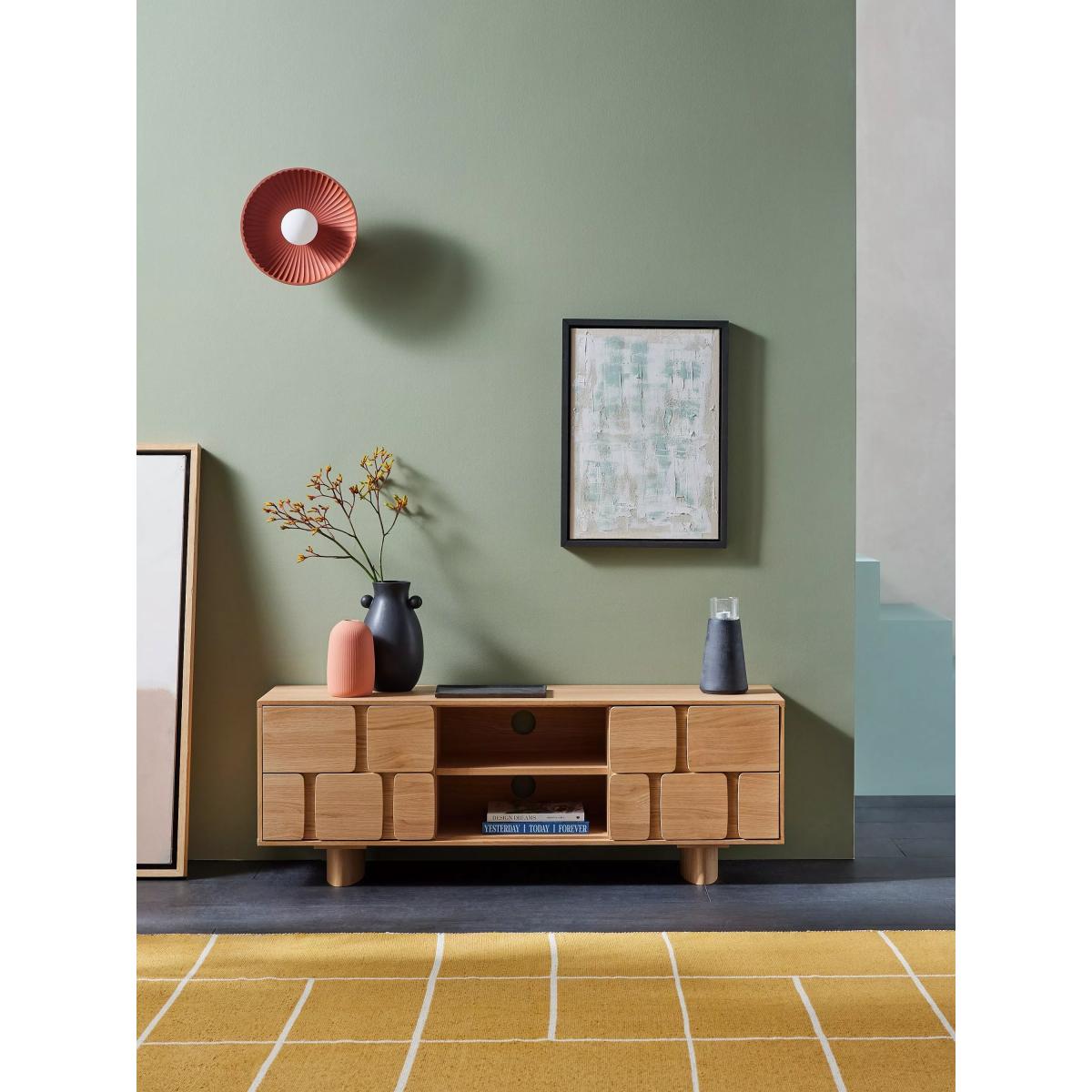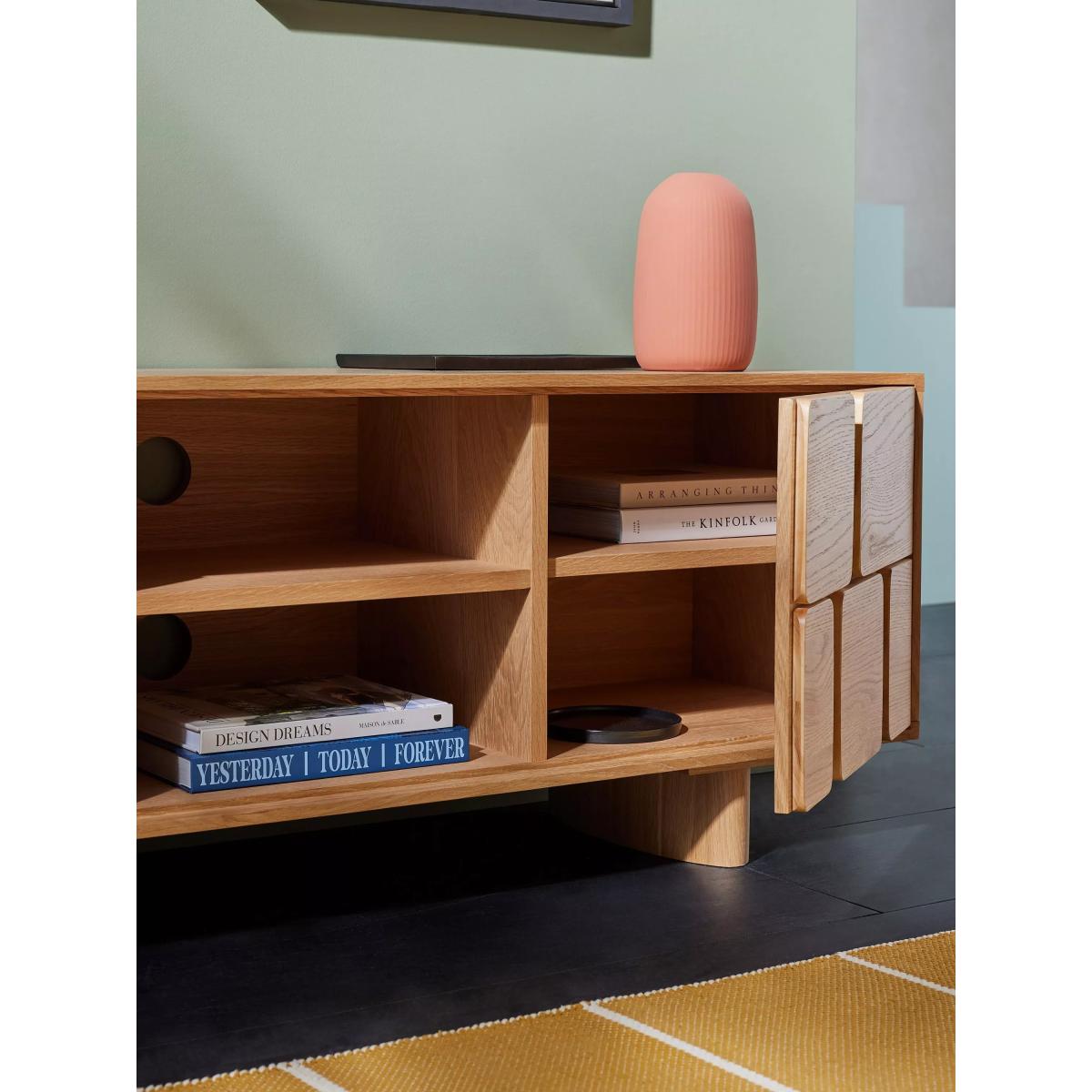 I’m a big fan of this Cory TV unit in oak because its warm, natural grain and playful block-style doors add subtle texture without overwhelming the room. It sits beautifully in Scandi-inspired or contemporary spaces, but its light hue also complements mid-century and Japandi schemes. For styling, hide your media kit in the side cupboards and use the central shelves to display low books stacks, a small speaker or a sculptural vase. Keep the top surface clear except for one or two low-profile pieces - perhaps a slim LED lamp and a trailing plant - to maintain a streamlined look. Pair with soft-tone rugs and minimal wall art to let the unit’s subtle detailing stand out.