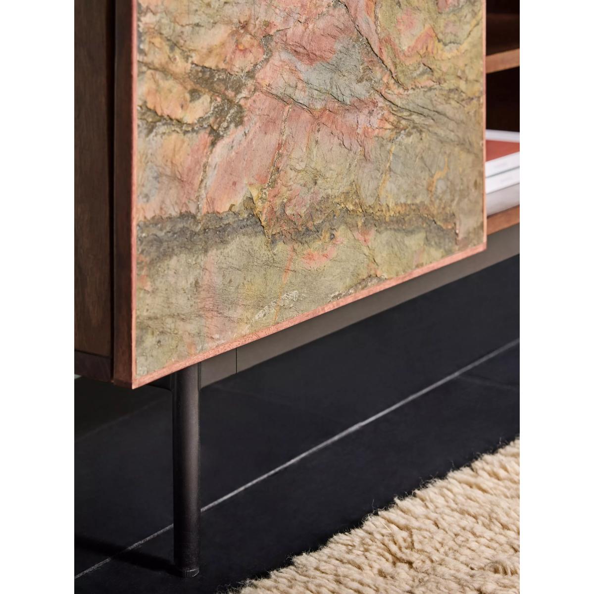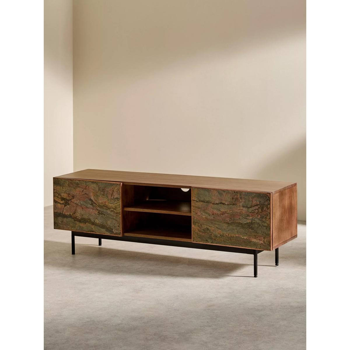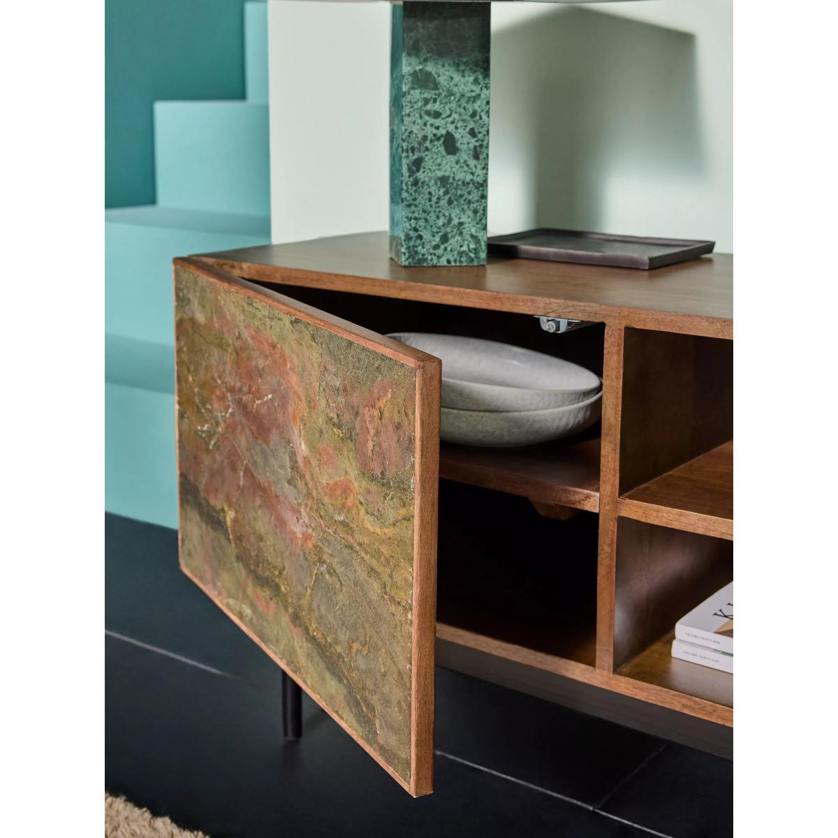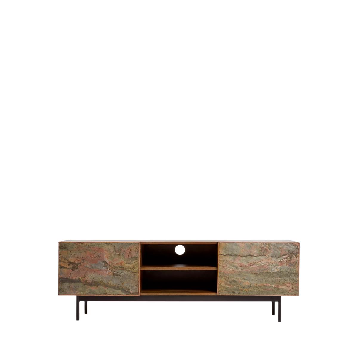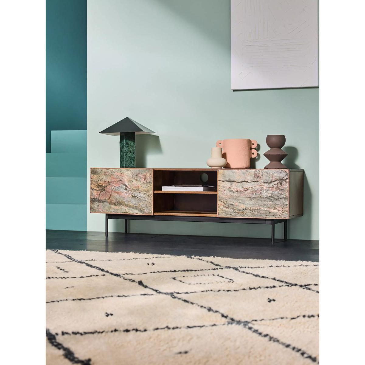 I’m a big fan of the Dilan unit for its blend of natural timber and muted multi-tone doors - it feels both lived-in and contemporary. The clean-lined silhouette and slim metal legs mean it works brilliantly in a Scandi, industrial or mid-century setting, while the subtle colour veining adds just enough interest to enliven a neutral scheme. For styling, keep your TV cables neatly gathered at the back and make use of the centred open shelf for media kit or a small plant. On top, balance a lamp or framed photo at one end with a low sculpture or vase at the other. Inside the cupboards, store remotes, games and cables in matching baskets to maintain a calm, uncluttered look.