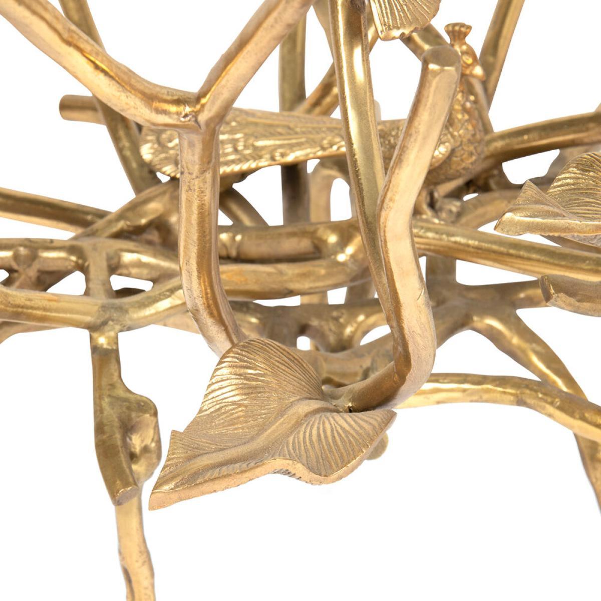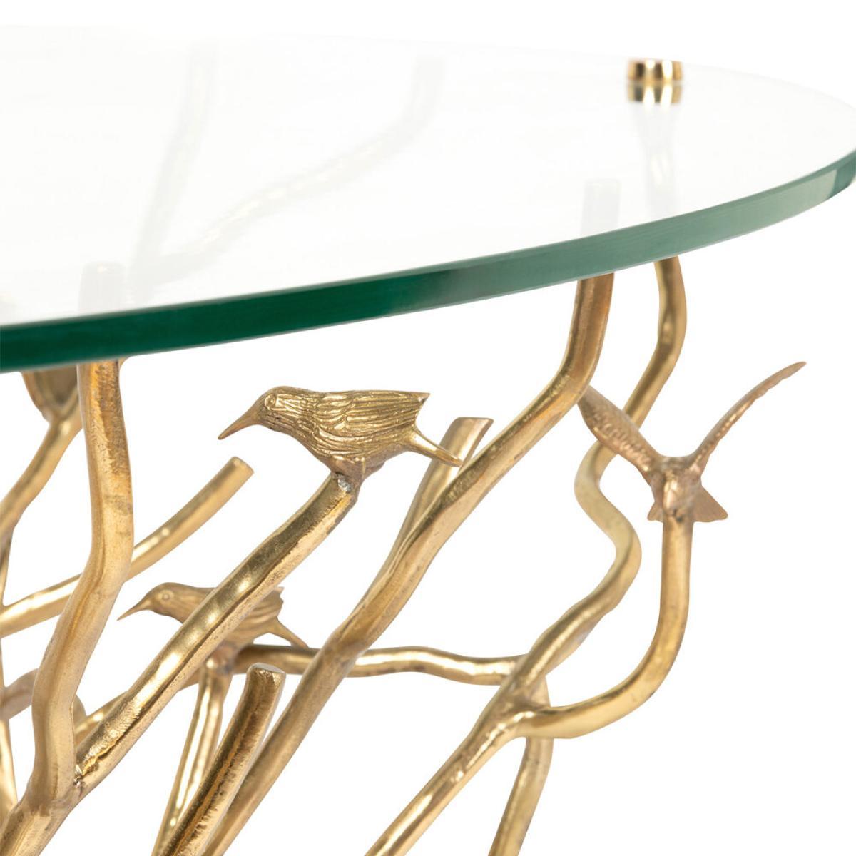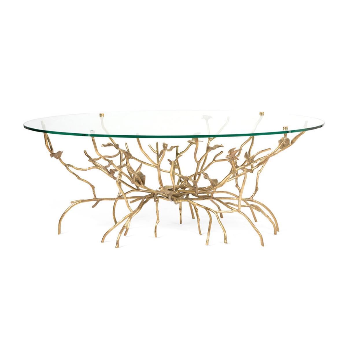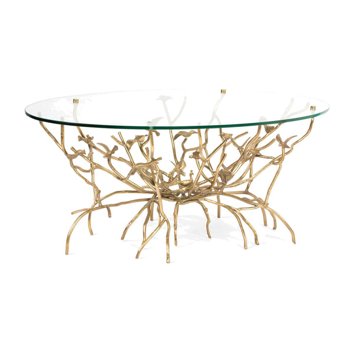 Bring some nature into your home Jerrah coffee table from Made Goods. Inspired by nature and fashioned from polished brass, a tangled cluster of interweaving branches, punctuated by birds perched on its leafy twigs, supports a clear glass top. A striking addition to any space, this coffee table is perfect for pairing with more accessories from Made Goods.