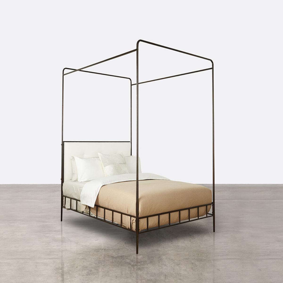 Make a simple statement with this Laken bed from Made Goods. Crafted from hand-wrought iron, the frame makes the most of clean lines and features a curved canopy that softens its angularity. With an upholstered headboard in cream and aged brass finish, it’ll complement any setting and add a dash of unique style.