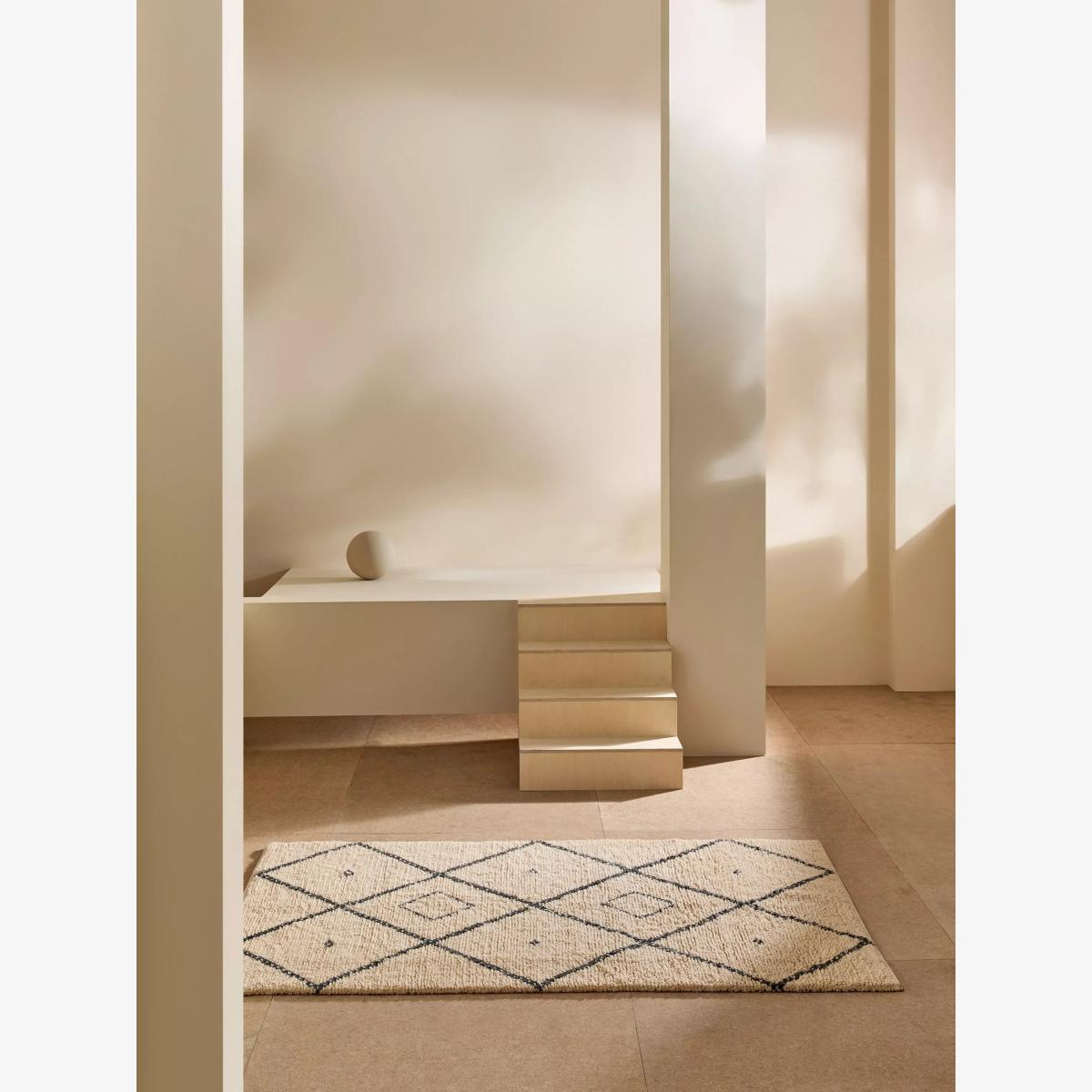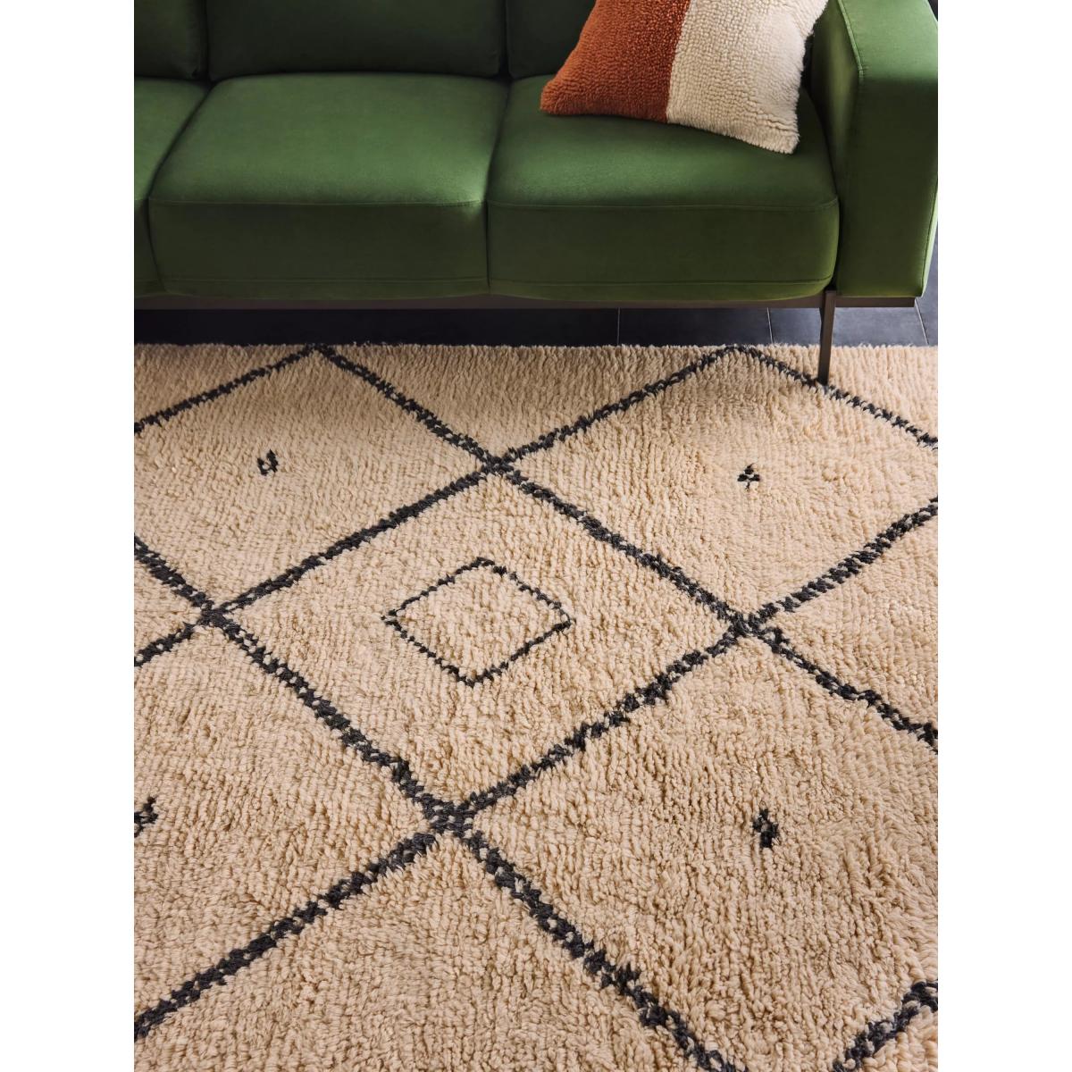 Simple yet striking, Mona is a superstar in the rug scene. Made from New Zealand wool with a deep shaggy pile and diamond geo design. About your new rug We recommend John Lewis & Partners Rug Hold Underlay. It prevents your rug from moving underfoot and protects against colour transfer to the floor As this rug is made using natural fibres, shedding is to be expected. This will reduce over time, and should not have an impact on the lifespan or performance of your rug. When you first get your rug, please use the brush attachment on your vacuum cleaner whilst the shedding dies down. After that, when vacuuming your rug, use suction only. Rotating brushes may damage the fibres. When vacuuming your rug, use suction only. Rotating brushes may damage the fibres Blot any spills with a clean, dry cloth. Do not rub or use harsh detergents. Attend to spillages immediately and blot with a clean, dry cloth to prevent staining. Dilute a small amount of appropriate carpet shampoo in water. Dampen a colourfast cloth in the diluted shampoo solution and dab the rug, lightly agitating, moving in the direction of the pile. Treat the whole rug and not just the affected area. To restore the appearance of the affected area, use a soft bristled brush to gently comb in the direction of the pile. Allow the rug to thoroughly dry.