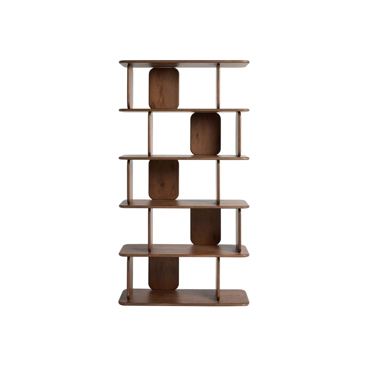I love the NYLA tall shelving unit for its modern, sculptural design that adds visual interest to any space. Its walnut finish provides a warm, natural tone that complements both contemporary and mid-century interiors. It’s versatile enough for a living room, home office, or bedroom, and works particularly well in spaces with neutral palettes, adding texture and depth. For styling tips, consider mixing objects with varying heights, such as vases, books, and decorative boxes, to create a balanced look. Additionally, using some open storage for books and keeping some shelves more sparse can enhance its architectural appeal, making it a statement piece that remains functional.