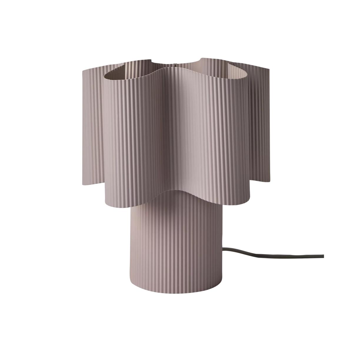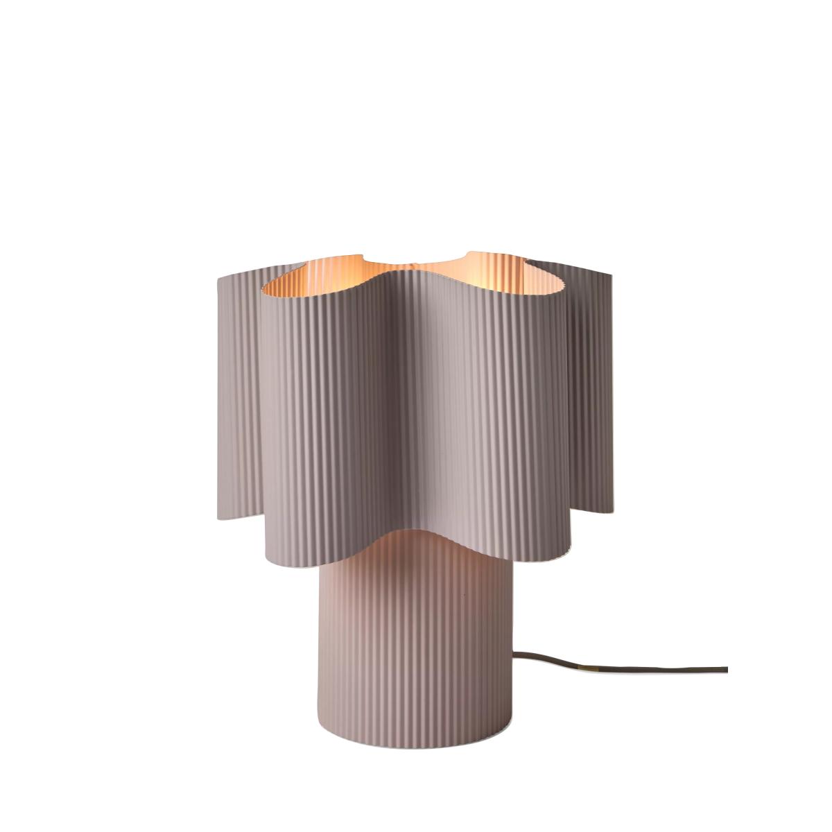 I love this lamp for its contemporary sculptural form and subtle lilac tone, which adds a soft yet sophisticated touch to various interiors. It works particularly well in modern or minimal spaces, including living rooms, bedrooms, or workspaces, where it can serve as a statement piece without overwhelming the decor. Practical styling tips include pairing it with neutral or pastel bedding and textiles for a cohesive look, or using it on a side table alongside brass or matte black accessories to create an architectural vignette. Its pleated texture also lends a tactile element that complements both smooth and textured materials, making it versatile for a range of styling approaches.