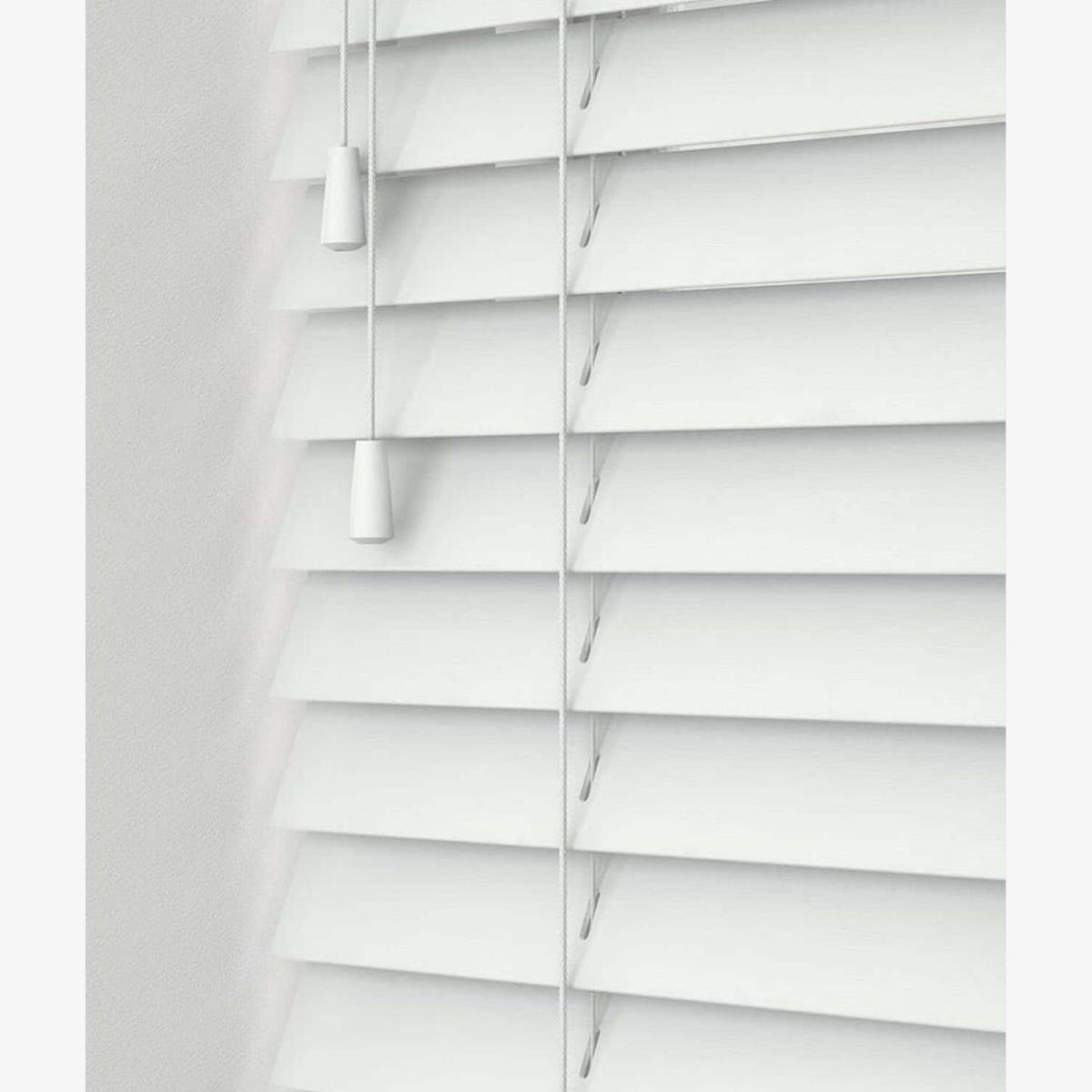 Custom Size Real Wood Venetian Blinds. They're made from sturdy thick slats that have a plain painted finish. These blinds are easy to fit and childsafe and can transform your room in under 30minutes.