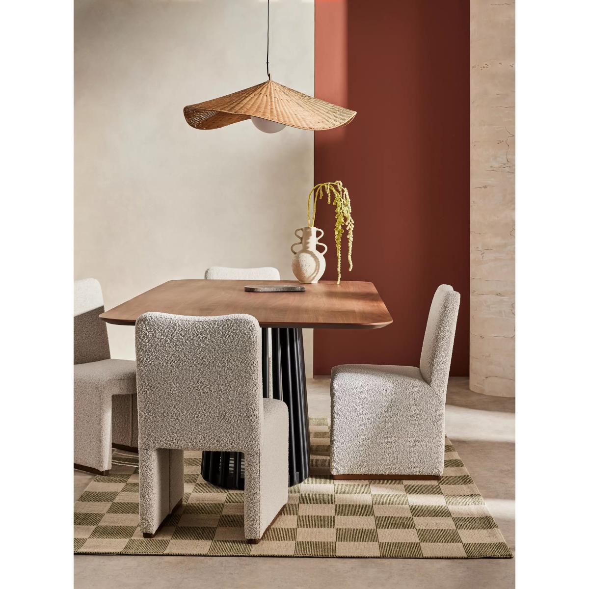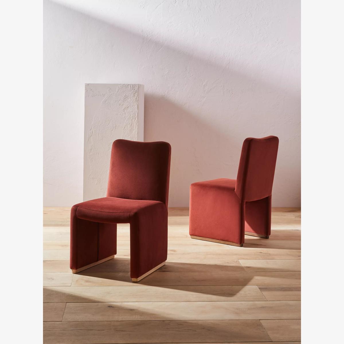 I’m a fan of this Tova chair for its clean lines and plush velvet upholstery - it feels both modern and inviting. The burnt-orange shade works beautifully in Scandi-inspired or contemporary schemes, and the subtle brass trim at the base adds just enough shine without feeling over the top. For styling, try lining a set of these around a light-oak table to introduce a warm contrast, or mix them with muted-grey chairs for a more eclectic look. Keep accessories simple - a woven jute rug and pared-back pendant lighting will let the chair’s texture and colour really stand out.