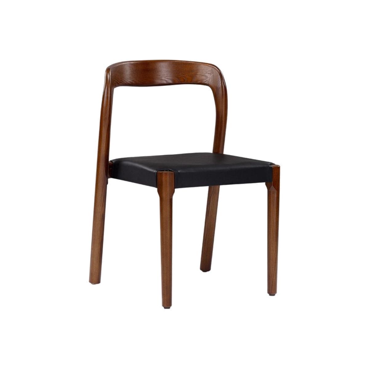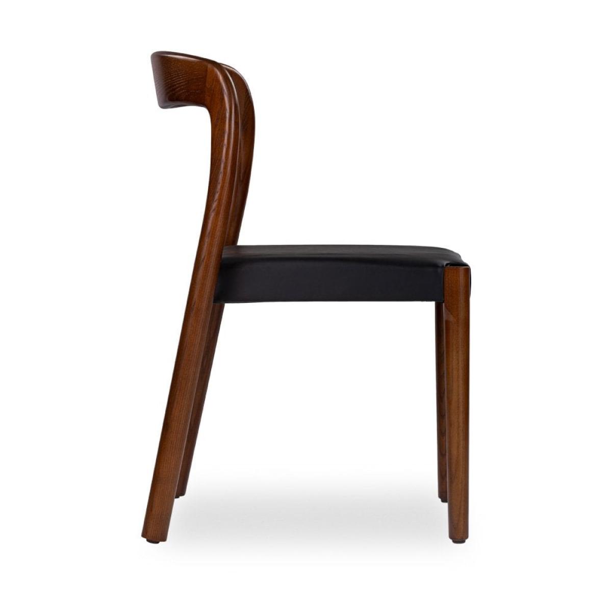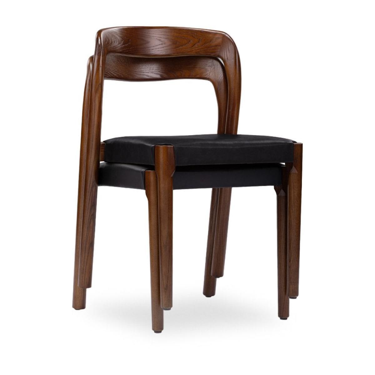 The Madeleine Wooden Dining Chair is the epitomy of Mid-Century Modern Design with its curved wooden backrest and faux leather seat. The frame is walnut-stained for a rich and warm finish, with black faux leather seat. Style meets functionality with this dining space showstopper that is also stackable.