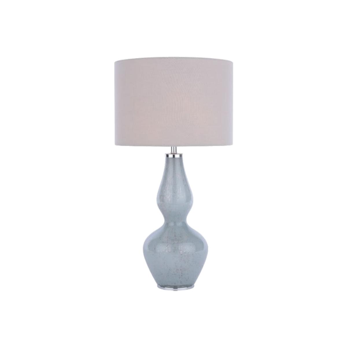 Contemporary table lamp featuring a blue glass base and taupe circular shade. Unique in design, the Mademoiselle table lamp features a blue glass base and taupe circular shade. The perfect lamp to add a quirky touch to any lounge, hallway or bedroom..