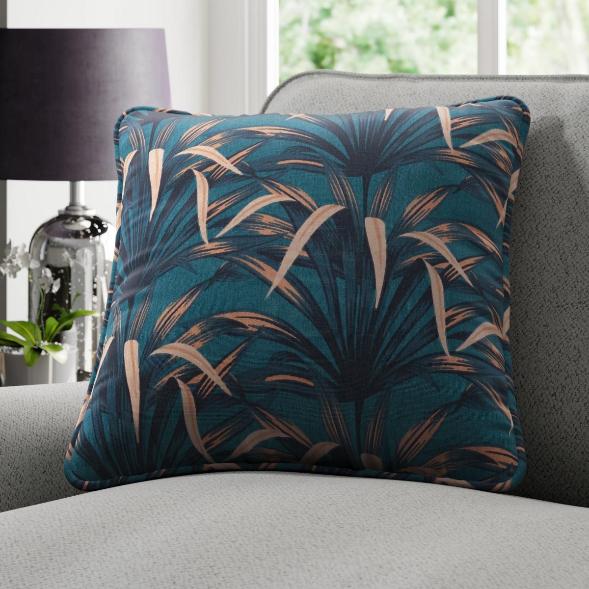 I love this cushion cover for its vibrant lagoon hue and bold botanical print, which makes it a versatile statement piece. It works particularly well in coastal-inspired interiors or as a lively accent in more neutral décors, adding colour and texture effortlessly. For styling tips, pair it with soft, muted cushions to let the pattern stand out or combine it with natural materials like rattan or linen for a relaxed, tropical vibe. Practical tip: because of its striking design, it’s perfect for placing on a sofa or armchair that needs a bit of visual interest without overwhelming the space.