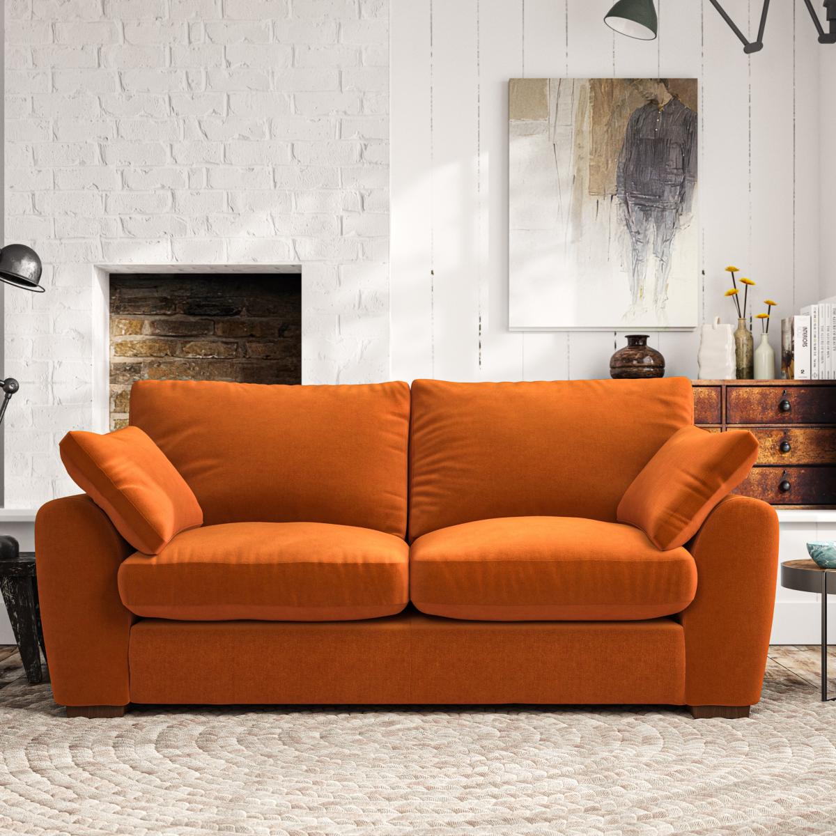 I’m a fan of this ginger velvet three-seater for its cosy yet sophisticated look - the rich terracotta tone lifts a neutral scheme without overwhelming the room. It sits just as comfortably in a Scandi-inspired space alongside pale woods and clean lines, or in a more eclectic setting paired with dark metals and patterned rugs. For styling, layer in cushions with a mix of textures (think boucle or wool) in muted greens or soft ochres to complement the warmth of the fabric. Keep it practical by rotating the seat cushions weekly and using a soft brush attachment on your vacuum to maintain that plush finish.