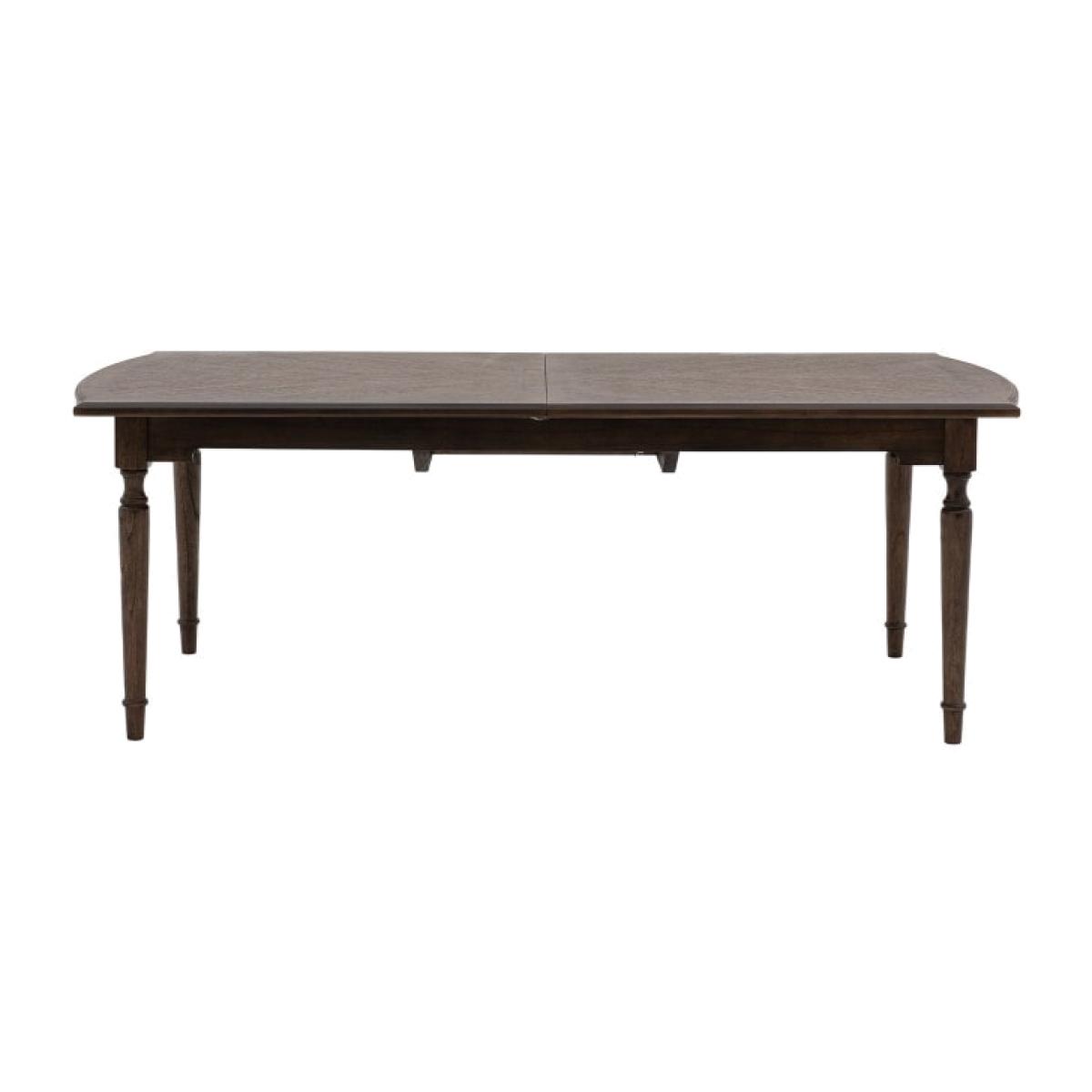 Designed to offer a ‘new traditional’ look with its timeless elegant style with a modern touch, this stunning table will add a sophisticated look to a room. The exquisite dark salvaged coffee coloured Mindy wood veneers and marquetry are complemented by the solid Mindy wood turned spindle legs. For added practicality the table features butterfly centre leaves, so it can be extended to seat up to 10 people.