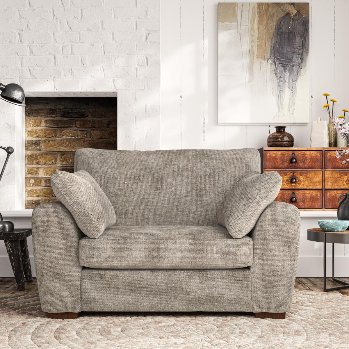I love this snuggle chair for its inviting, chunky chenille fabric and versatile design, making it a great addition to both contemporary and cosy traditional interiors. Its plush cushions and rounded arms create an inviting, comfortable look, perfect for relaxed living spaces. Styling-wise, it works well paired with neutral tones for a calming scheme, or styled with colourful cushions and throws for a cosy, layered effect. Practical tips include placing it in a lounge or corner of a larger seating area to serve as a cosy retreat, and using textured textiles nearby to emphasise its tactile appeal. This piece is ideal for creating a welcoming, lived-in atmosphere whilst offering great comfort.