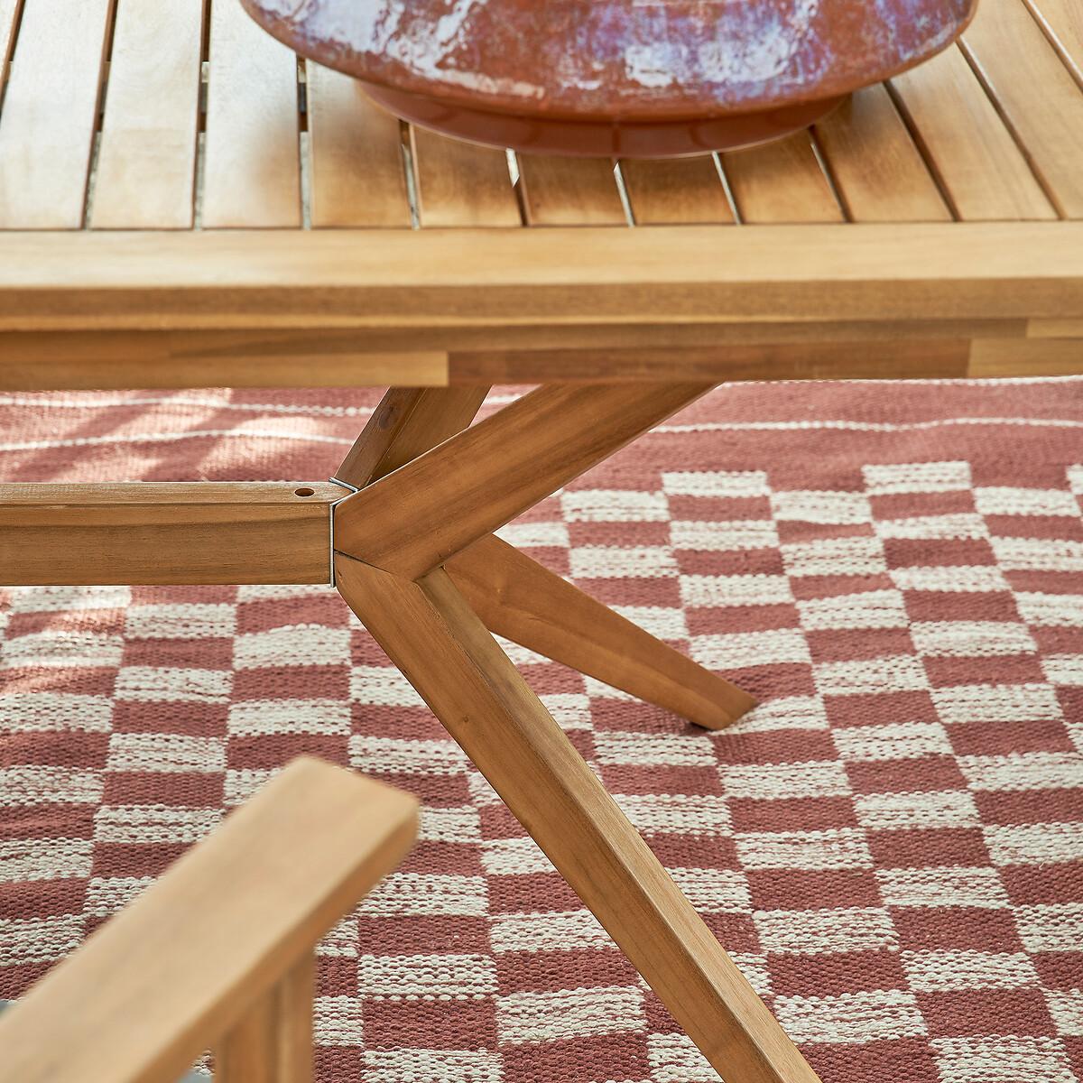 The Madotto rug. Checkerboard and terracotta are the highlights of this rug, which can be used indoors in the living room or outdoors to warm up the terrace. This rug is designed for the outdoors too; unaffected by UV and water. Product Details • 100% recycled polyester • Dried wool look • Craftsmanship: Hand woven • Weight: 1950g/m² • Thickness of rug: 8mmSizes. Size 1 • Width: 120cm • Length: 180cm. Size 2 • Width: 160cm • Length: 230cm. Size 3 • Width: 200cm • Length: 290cmDelivery:. Available for home delivery. • Recycled polyester. Using recycled polyester is all about conserving resources and reducing waste. Dimensions and weight of parcel • Size 1: 130 x 18 x 18cm. 4.8kg • Size 2: 175 x 20 x 20cm. 8.7kg • Size 3: 215 x 23 x 23cm. 13.6kg