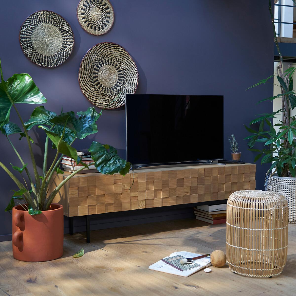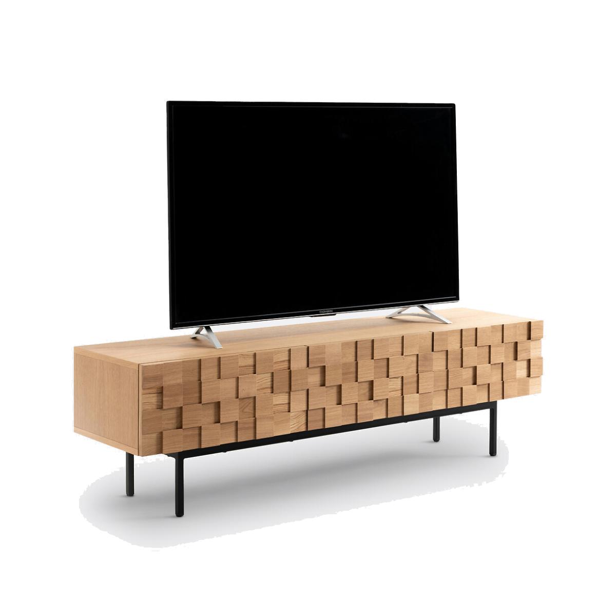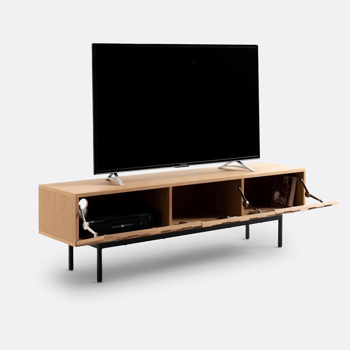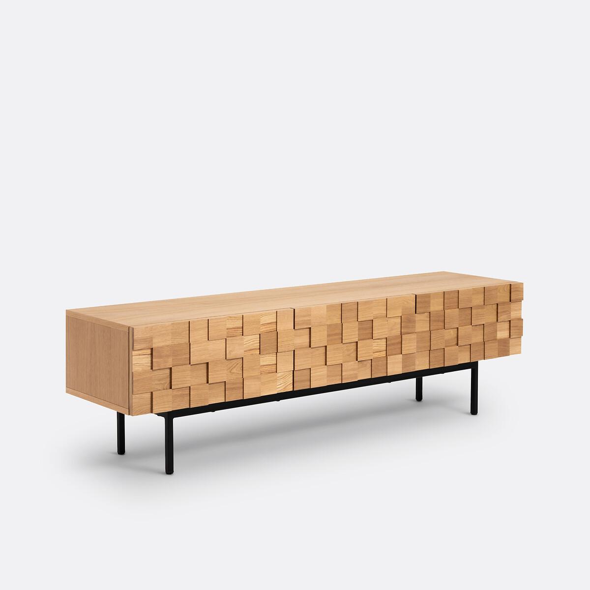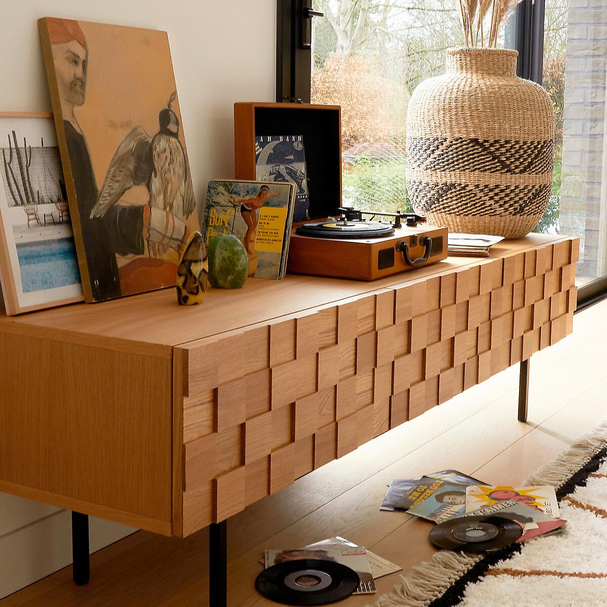 The Madria oak TV cabinet is characterised by the front of its doors which are skilfully worked in a checkerboard design. A charming design which gives the illusion of a textured door... A spectacular piece of furniture to proudly display in the living room. Designed by La Redoute Intérieurs. Made in Europe. Product Details • Cabinet and shelf in oak veneered particle board • Steel base, black paint, epoxy finish • 3 doors in checkerboard veneered particleboard with solid oak squares in 3 depths (15/20/25mm) • Colourless nitrocellulose varnish finish • Drop-down doors • Compass hinges • Can accommodate a 65 "inch screen • Max weight supported: 50kg • Adjustable polyethylene glidesDimensions. Overall • Length: 163.5cm • Height: 46.2cm • Depth: 40.6cm • Height of legs: 20cm. Usable space • Compartment: L56 x H22.5 x D36cmDelivery:. Assembly required. Available for home delivery. Note! Please check that all access points are large enough to accommodate your delivery (doors, stairs, lifts). • Made in Europe. • WOOD FROM SUSTAINABLY MANAGED FORESTS. FSC® certified wood comes from forests that are environmentally, socially and economically well managed. Dimensions and weight of parcel3 parcels • L197 x H9 x D53cm - 27.2kg • L76 x H11 x D34cm - 14.7kg • L176 x H6 x D55cm - 15kg