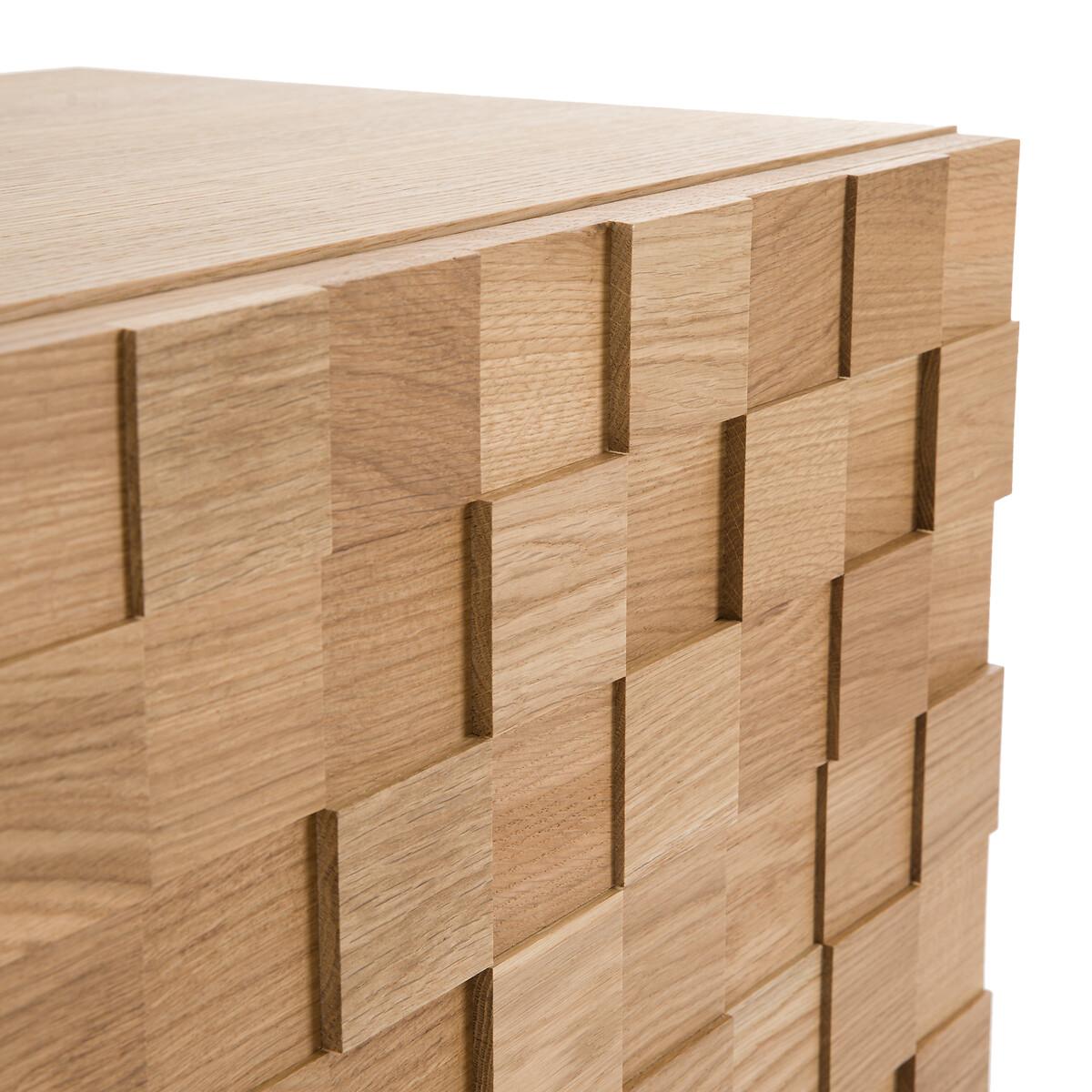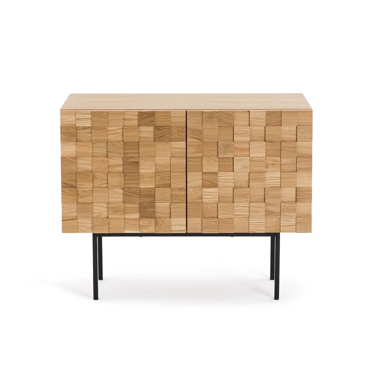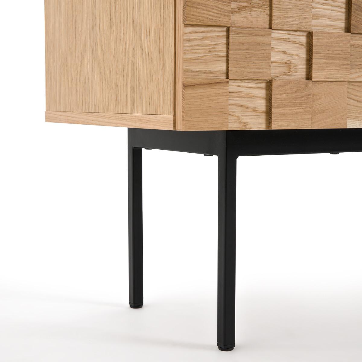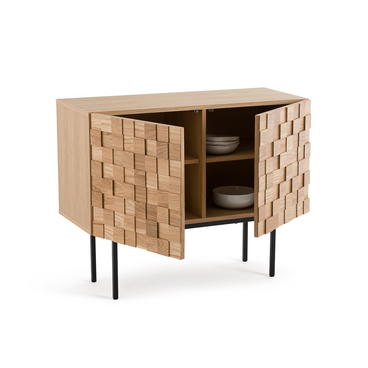 The Madria oak sideboard is characterised by the front of its 2 doors skilfully worked in a checkerboard pattern. A show of depth that gives the illusion of carved wood. A spectacular piece of furniture, made in Europe, to proudly display in the living room, in the entranceway or even in the bedroom! Designed by La Redoute Interiors. Product Details • Cabinet and shelf in oak veneered particle board • Checkerboard veneered particleboard doors: squares in solid oak wood in 3 depths (15/20/25 mm) • Colourless nitrocellulose varnish finish • 2 doors, 1 vertical divider, 2 removable and adjustable shelves, 4 compartments • Door hinges "soft closing" • Steel base, black paint, epoxy finish • Plastic feet pads • Assembly requiredDimensions. Overall • Width: 104.5cm • Height: 84.5cm • Depth: 45.5cm. Usable space • Compartment (without shelf) :L49 x H48 x D38.5cm. Responsible product • Choosing a product made in Europe means selecting a product that has less carbon impact, because it has travelled less. As good for you as it is for the environment. Choosing a product manufactured closer to home reduces the impact on the environment and is better for everyone. Dimensions and weight of parcel3 parcels • L82 x H12 x D59cm. 10.5kg • L96 x H36 x D33cm. 8.1kg • L121 x H12 x D55cm. 32.6kg