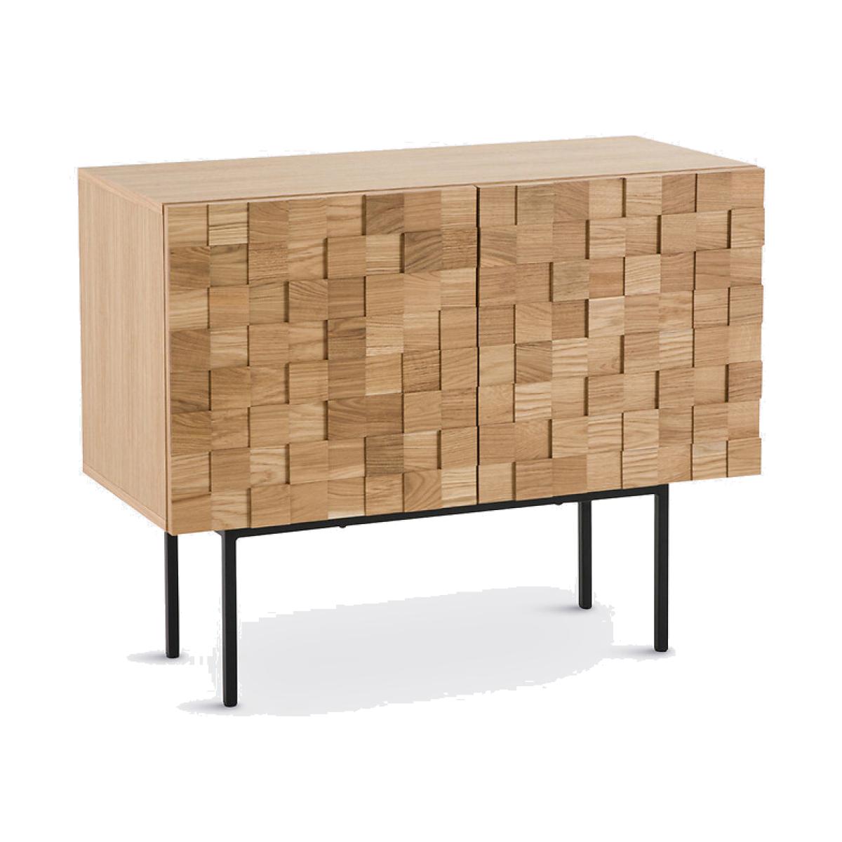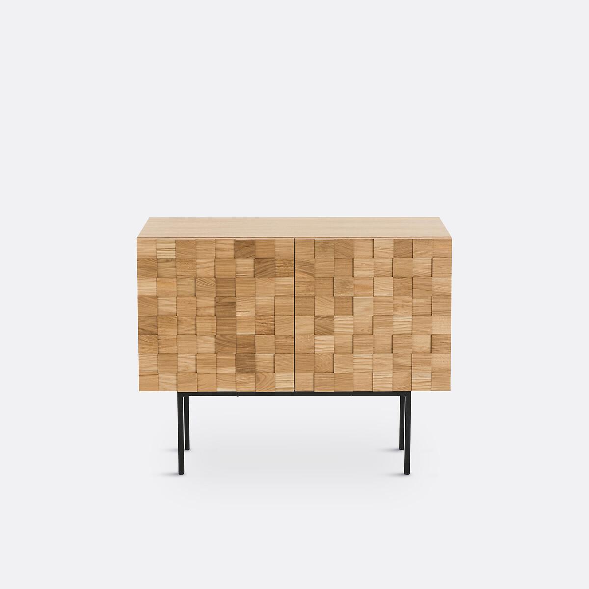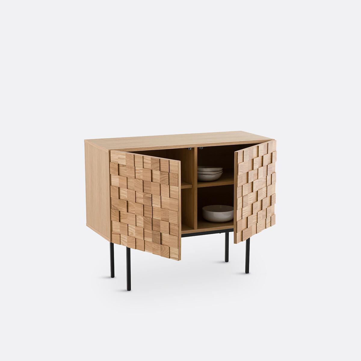 The Madria oak sideboard is characterised by the front of its 2 doors skilfully worked in a checkerboard pattern. A playful design which gives a textured look, as though the doors had been sculpted. A spectacular piece of furniture, made in Europe, to proudly display in the living room, in the entranceway or even in the bedroom! Designed by La Redoute Intérieurs. Product Details • Cabinet and shelf in oak veneered particle board • Checkerboard veneered particleboard doors: squares in solid oak wood in 3 depths (15/20/25 mm) • Colourless nitrocellulose varnish finish • 2 doors, 1 vertical divider, 2 removable and adjustable shelves, 4 compartments • Door hinges "soft closing" • Steel base, black paint, epoxy finish • Polyethylene glidersDimensions. Overall • Width: 104.5cm • Height: 84.5cm • Depth: 45.5cm. Usable space • Compartments (without shelf) : L49 x H48 x D38.5cmDelivery:. Assembly required. Available for home delivery. Note! Please check that the openings (doors, stairs, elevators) allow the passage of the package during delivery. • Made in Europe. • WOOD FROM SUSTAINABLY MANAGED FORESTS. FSC® certified wood comes from forests that are environmentally, socially and economically well managed. Dimensions and weight of parcel3 parcels • L82 x H12 x D59cm. 10.5kg • L96 x H36 x D33cm. 8.1kg • L121 x H12 x D55cm. 32.6kg