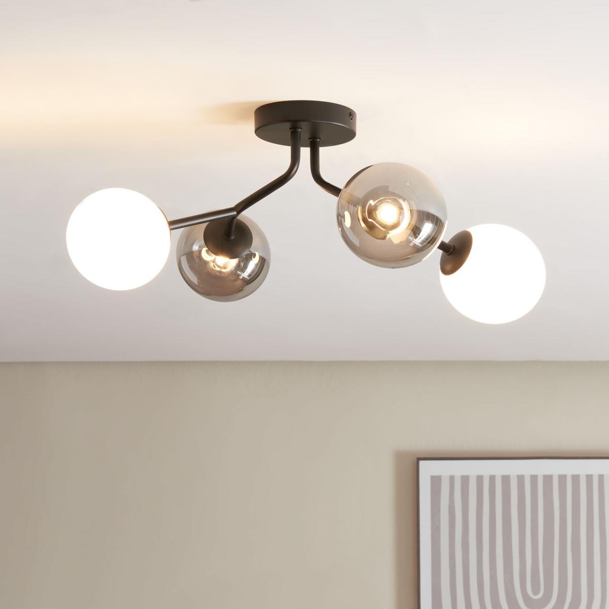 I love this black ceiling light for its contemporary yet versatile style. Its clean lines and dual-tone glass globes give it a modern edge, making it a great focal point in minimalist, industrial, or even eclectic interiors. It works particularly well in living rooms, kitchens, or dining areas where you want to add a statement piece without overwhelming the space. Practical styling tips include pairing it with neutral or monochrome colour palettes to let the light fitting stand out, and keeping the surrounding decor simple to highlight its sleek design. For a more layered look, consider using dimmable bulbs to adjust the ambience or complement it with matching black accessories for a cohesive finish.