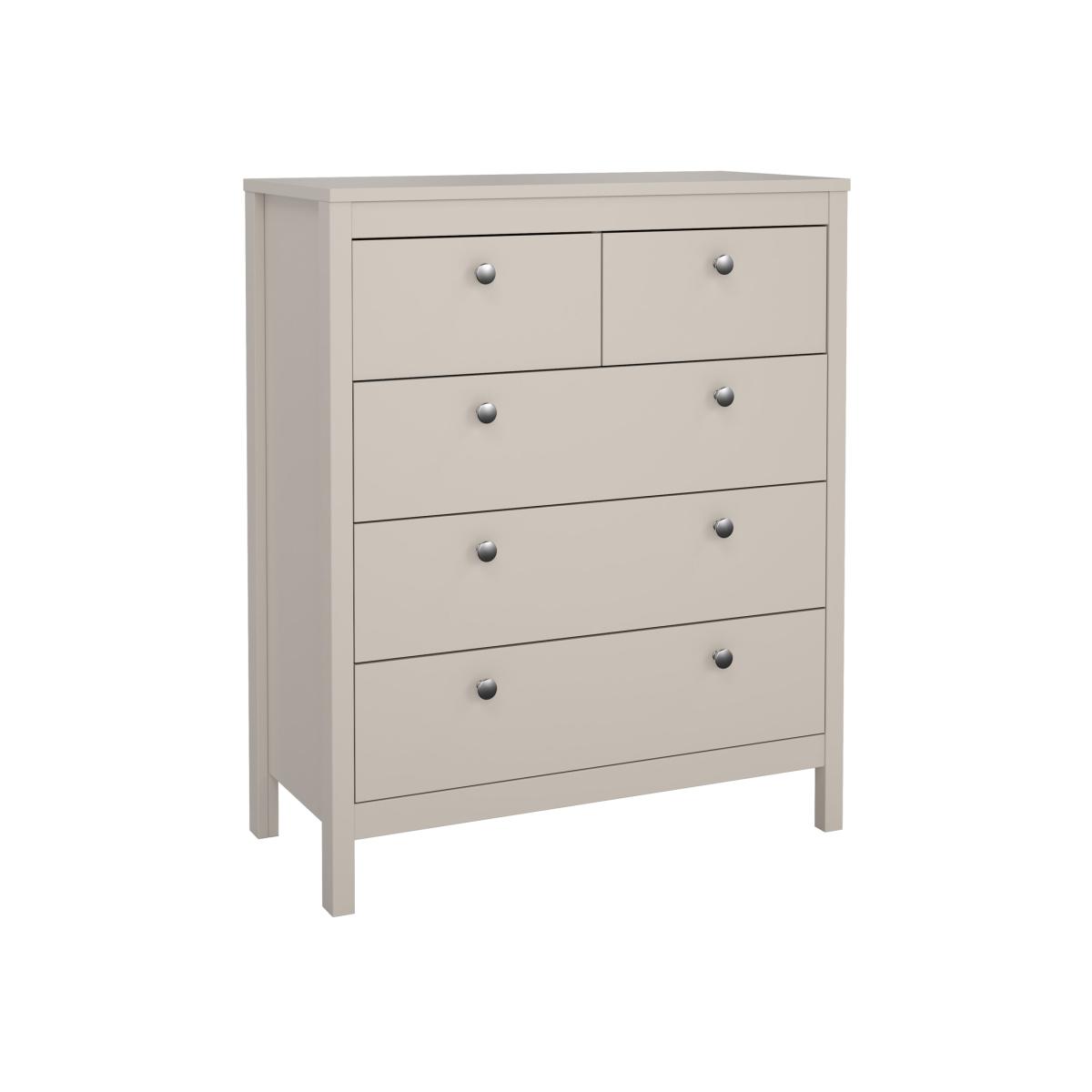 Enhance your home's allure with the Madrid Chest of Drawers. This chest is designed with clean lines and a sleek finish, adding a touch of timeless elegance and practicality to your living space. Its soft neutral tone complements a variety of existing decor styles whilst bringing calming elegance to any room. It's thoughtfully crafted to be compact enough for smaller spaces, ensuring it fits perfectly in your home. The drawers provide ample storage space for notebooks, office supplies, gadgets, and knick-knacks, allowing you to declutter your space with ease. The drawers glide smoothly for easy access, and the stylish handles give them a modern finishing touch, making this piece a great option for any living room, bedroom, hallway, or dining area.