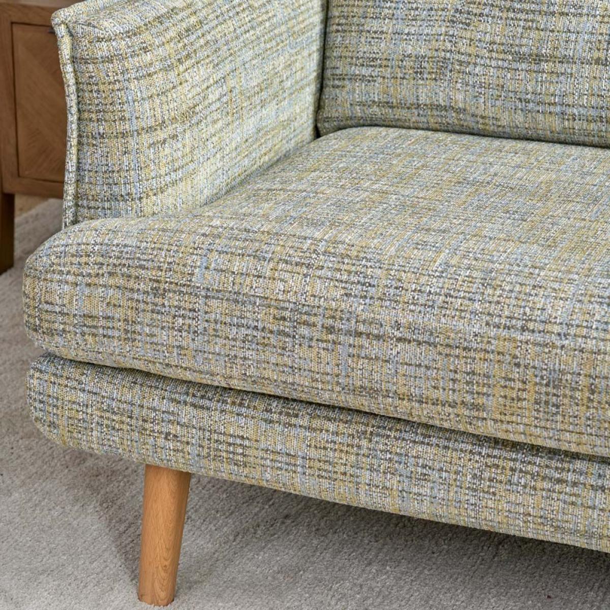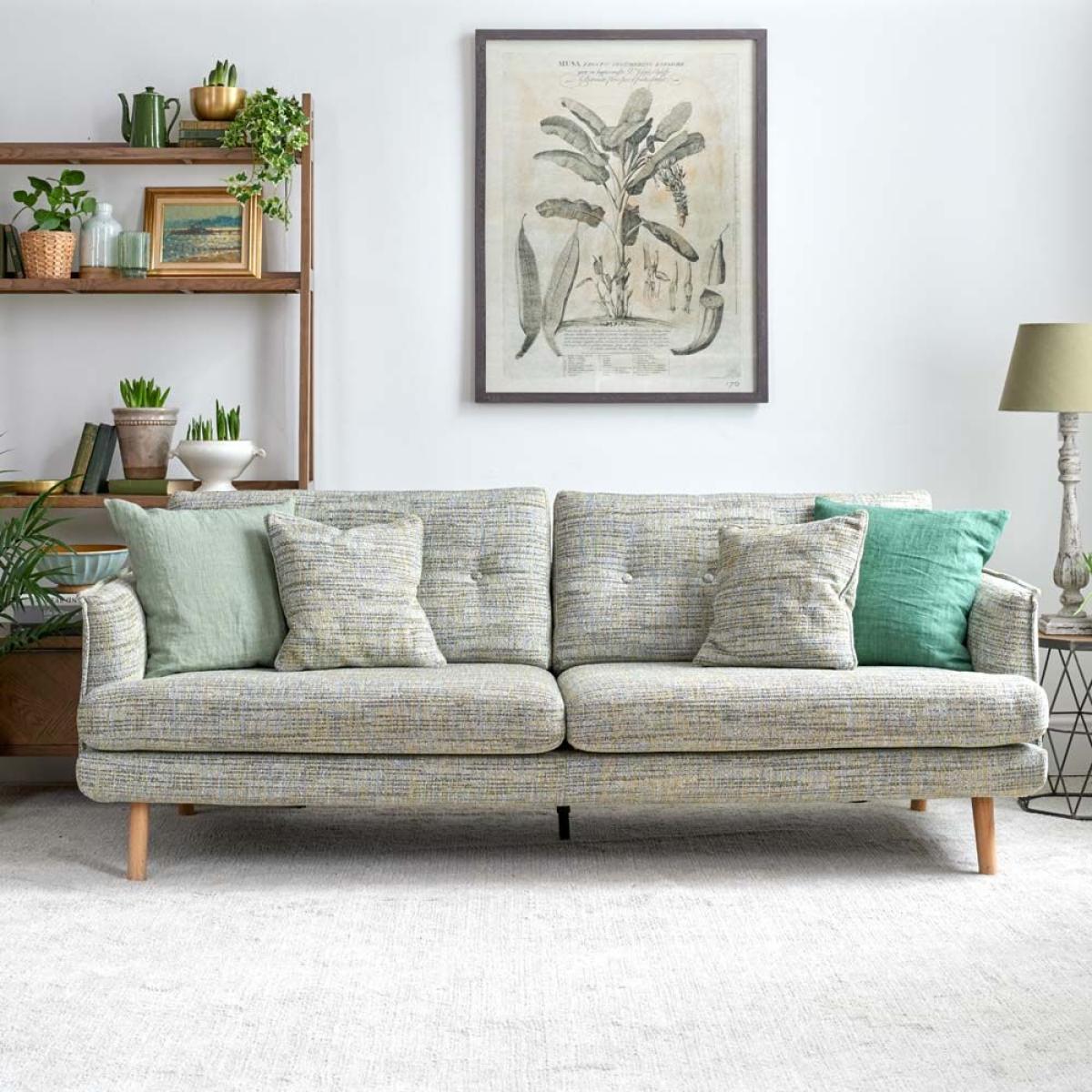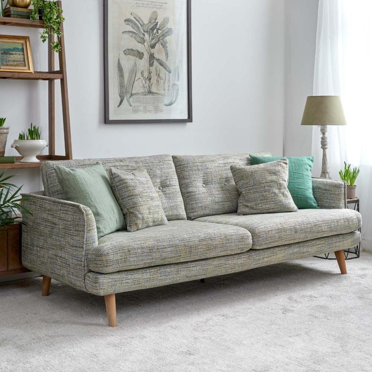 The Madrid Extra Large Sofa is a low slung sleek design with great proportions and ample seating space. The sofa easily sits three people. Handmade in the EU the sofa's quality is exceptional, and it's upholstery is neat and perfectly fitted. The rear cushions have buttoning detail while the outer edges of the arms are pipted to accentuate the line. In addition to the four oak legs, the sofa also has a central leg for additional support. Available here in Torino Springtime Cotton Weave, but with more fabric options coming soon.