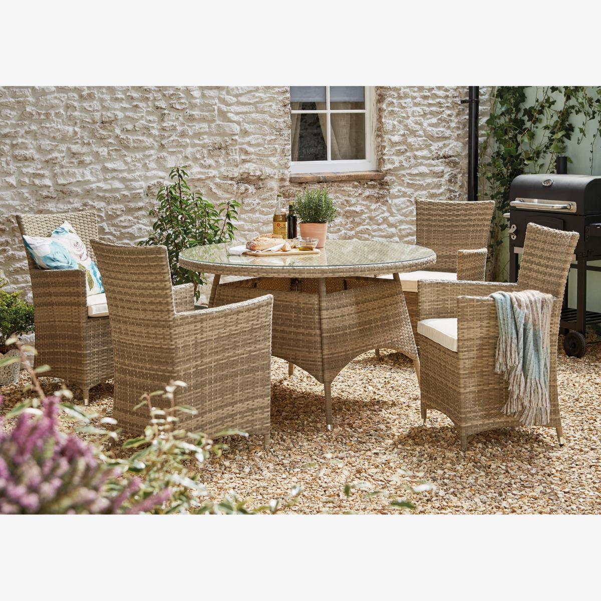 The stunning Madrid Five Piece Dining Set will provide the perfect focal point for all your special outdoor occasions. The beautifully crafted rattan offers the set a traditional yet elegant aesthetic, while the plump cushions provide luxurious comfort. Four chairs and a large glass table top come together to create the ideal space for al fresco dining, garden parties or simply soaking up some sun. What's more, the sturdy aluminium frame offers strength and durability for a set that you will be sure to use year after year.
