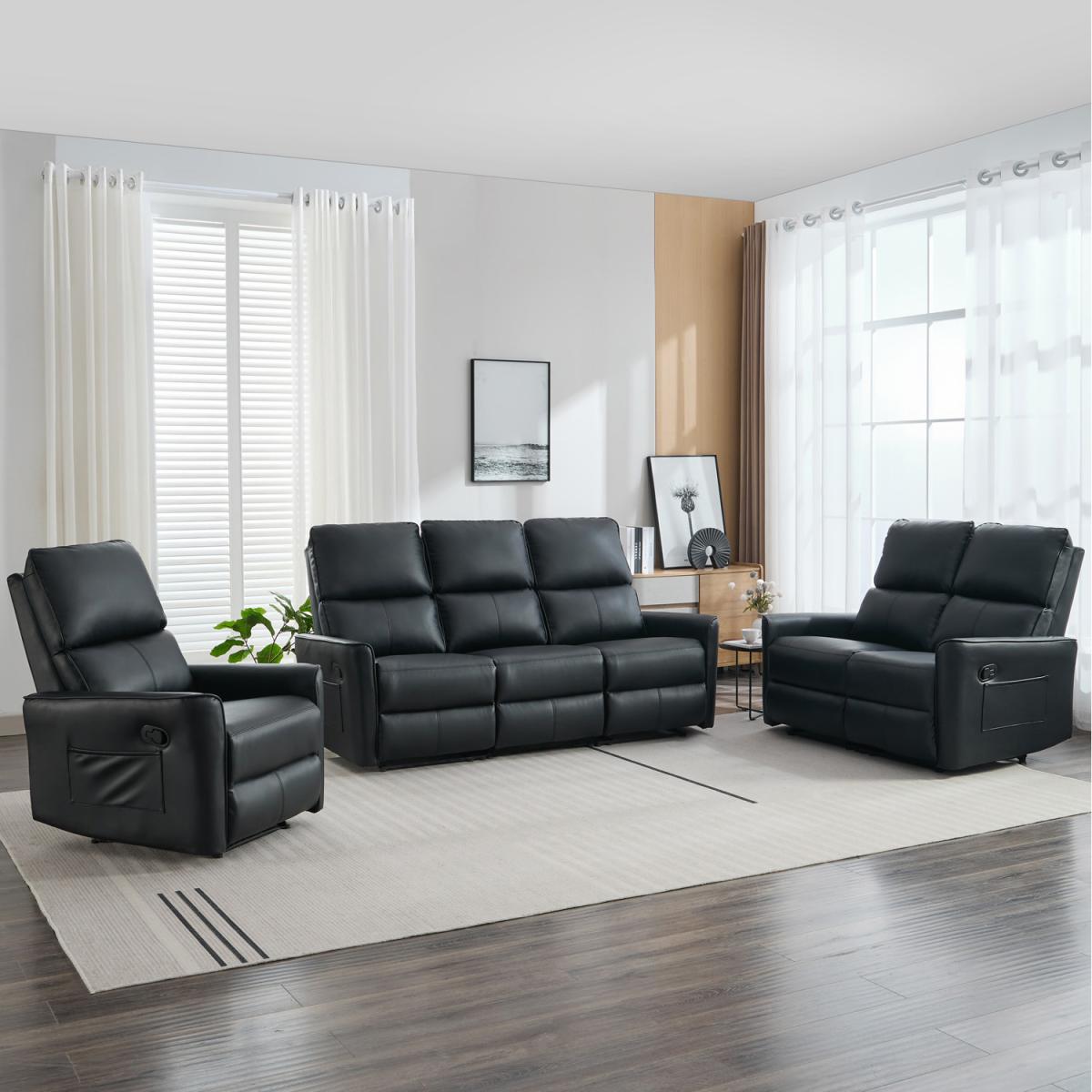 Snuggle together in style with the Madrid Manual Sofa Set. The Madrid is upholstered with premium soft Air Leather, providing a plush and inviting feel, ensuring your relaxation is unmatched. With deep foam padding, lumbar support, and pocket springs you will not want to leave this gorgeous Sofa. Recline with ease with the easy to use recline function. Simply lift the latch on the side of the Sofa, put your feet up and relax. Available in Black and Grey, the Madrid Latch Recliner Sofa is the perfect addition to your living room. Material: Air Leather Height: 102cm Width: 1, Seater: 77cm, 2 Seater: 131.5cm, 3 Seater: 188cm Depth: 94.5cm Seat Depth: 53cm Height: 48cm Seat Width: 1 Seater: 54cm, 2 Seater: 110cm, 3 Seater: 166cm Backrest Height: 68cm Armrest Height: 57cm Maximum Weight Rating: 114 kg Warranty: 12 Months