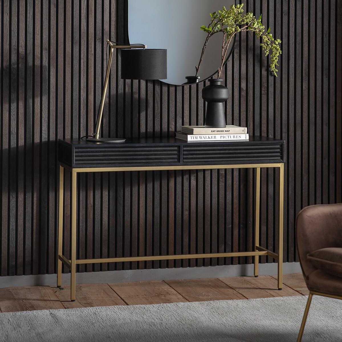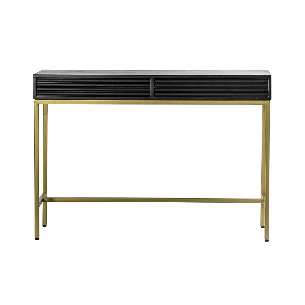 Stunning black wood combined with a gold-finish metal base creates an eye-catching piece. The mango wood drawer fronts are textured, creating a ripple effect which catches the light. Product details2 Drawers. Fixed shelving. Anti-topple kit provided. Assembly required. Product Composition - Mango wood, Iron, Veneer. Product Dimensions - 40 cm x110 cm x78 cm , Weight - 25 KGInternal Drawer Size- 47 x 31 x 6.5 cm Parcel 1 Packaged Dimensions - 118 cm x 53 cm x 25 cm, Weight 22.4 kg Parcel 2 Packaged Dimensions - 116 cm x 72 cm x 16 cm, Weight 9.9 kg. This product will be dispatched by one of our trusted suppliers. You’ll be contacted by their selected courier about your delivery. Please note: this product cannot be delivered to all Offshore Islands, Northern Ireland or Republic of Ireland.