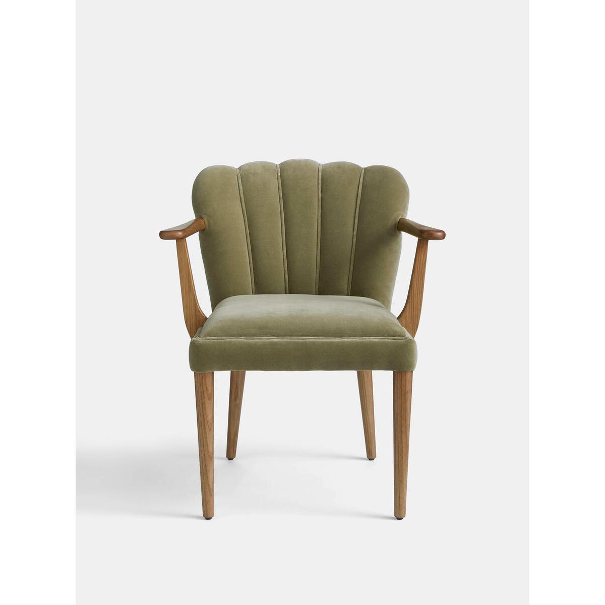 A fluted, scallop-edge back sets the Mae dining chair apart to bring an essence of vintage glamour to feasting with friends and family, while mirroring the aesthetic of Soho House Rome. Upholstered in cotton velvet with a solid oak frame and self-piped detailing. Vintage-inspired dining chair Solid oak frame Upholstered in cotton velvet Fluted scallop-edge back Self-piped detailing Inspired by Soho House Rome