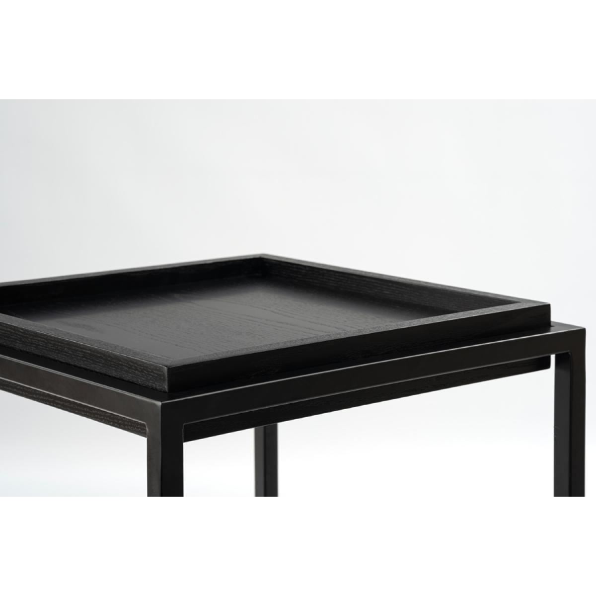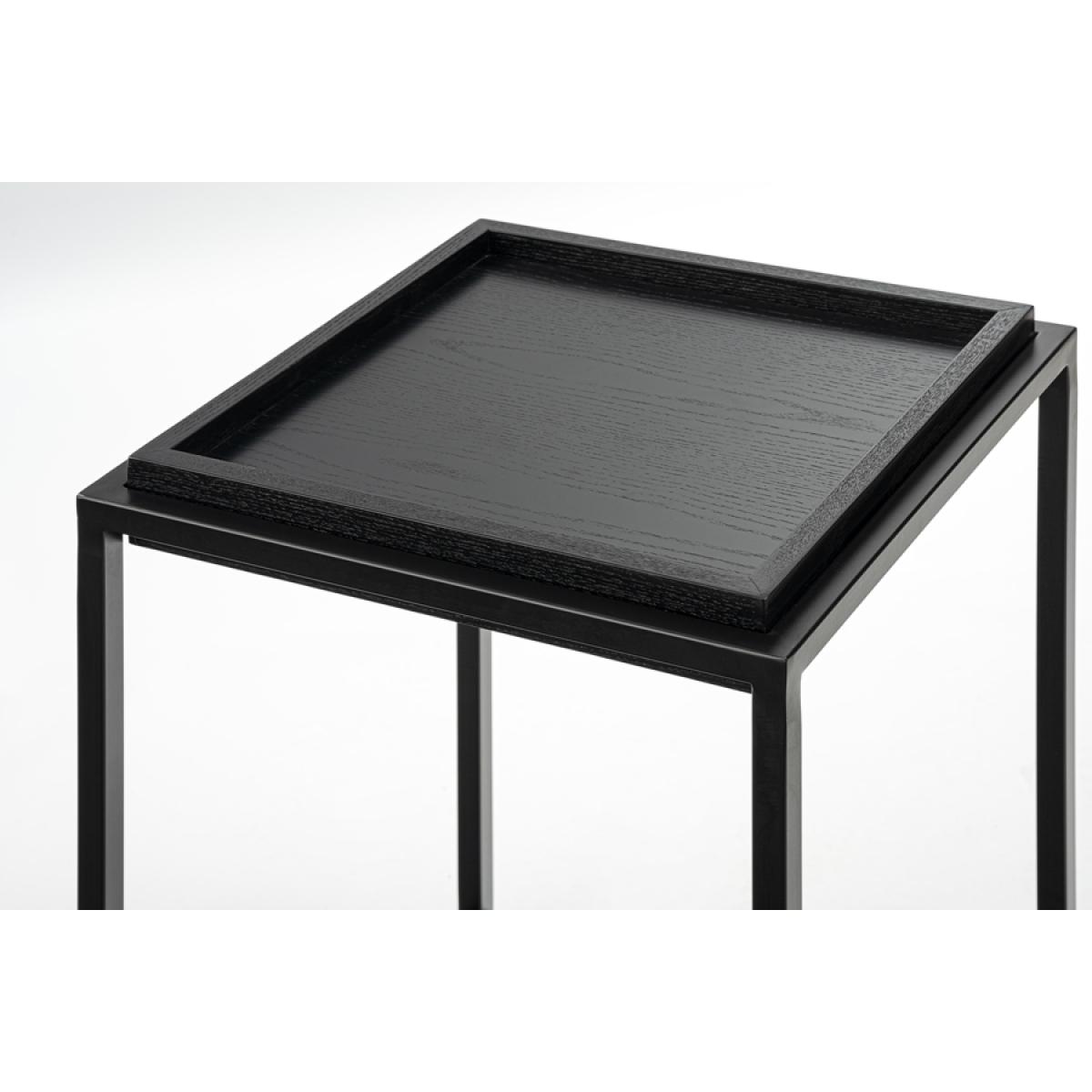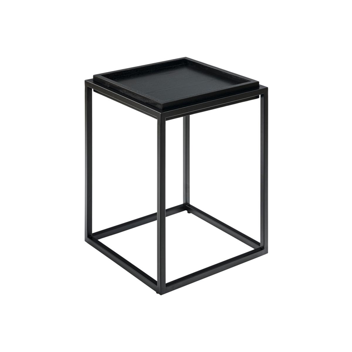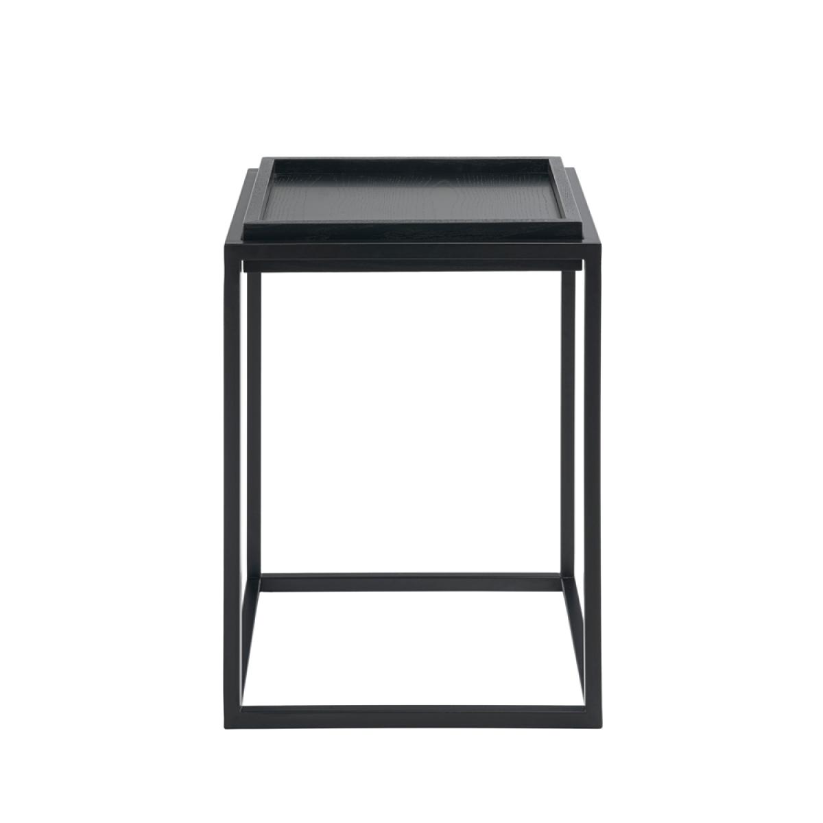A sleek, contemporary side table with a fixed tray top design. Steel frame with black satin powder-coated finish. Ash veneered top with black satin finish. Supplied fully assembled.