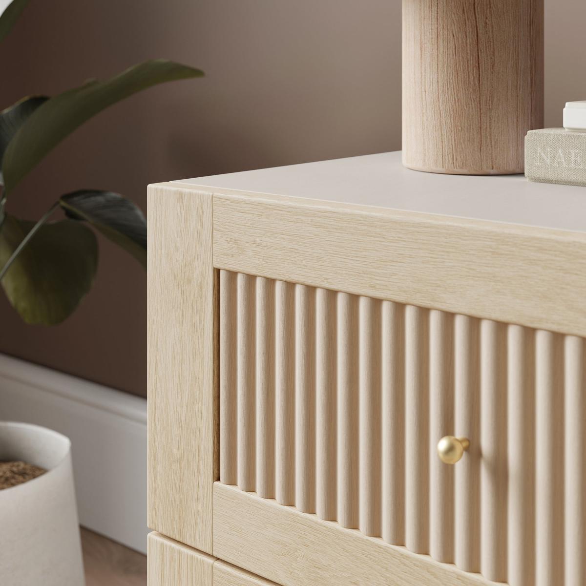 I’m a fan of the Maeva bedside in light oak effect for its subtle fluted detailing and neutral tone, which instantly lifts a room without overpowering it. Its clean lines and two drawers make it ideal for streamlined Scandi, minimalist or coastal schemes, while the light finish keeps smaller bedrooms feeling open and bright. Styling tip: pair it with a low-profile lamp and a small vase or ceramic bowl to balance the wide top, and keep one drawer for bedtime essentials and the other for less-used items. A simple woven or jute mat beneath adds textural contrast and anchors the table in any scheme.