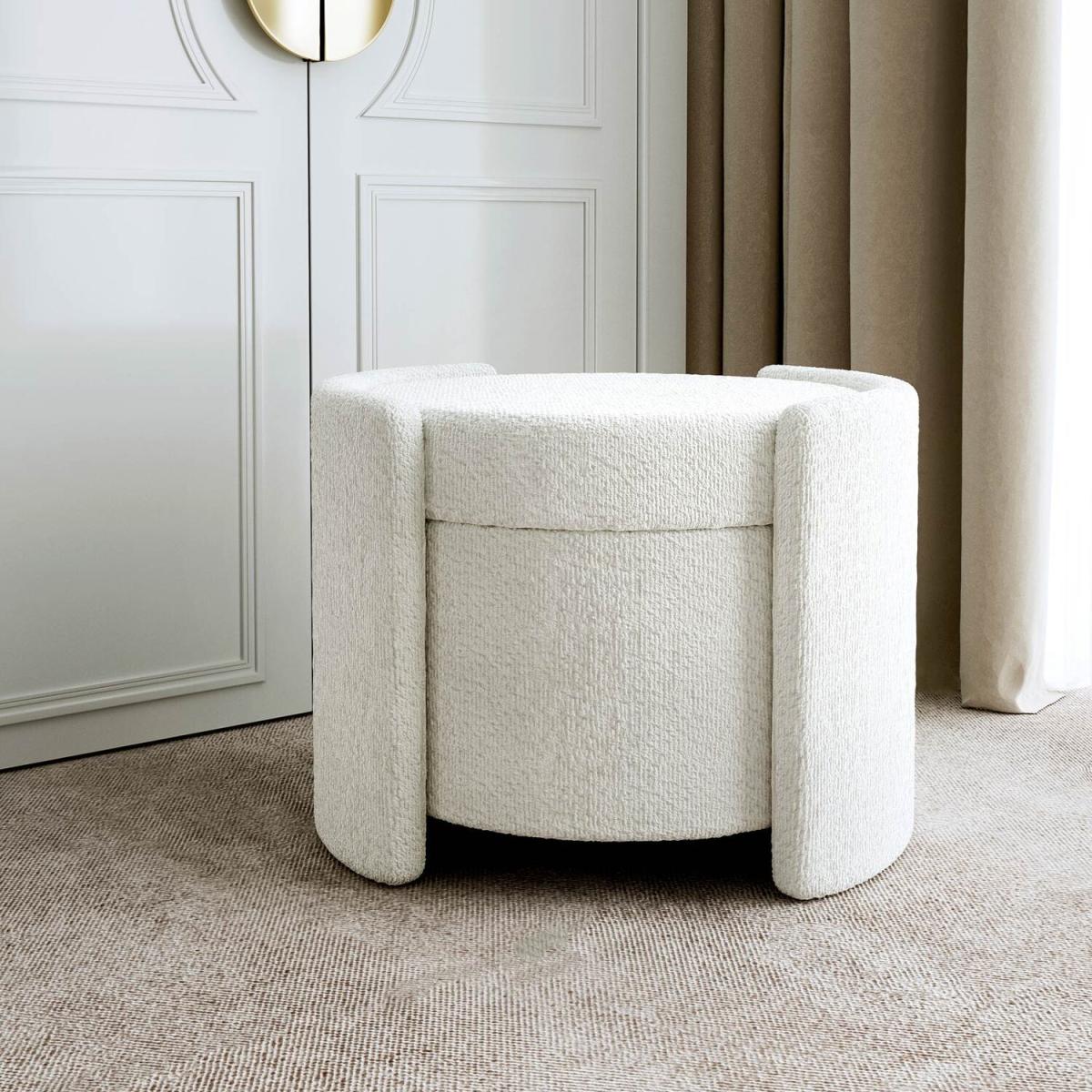 Maeva is the perfect addition to any room, featuring a boucle fabric the stool is versatile and will transform any interior. Maeva is the perfect addition to upgrade your current dressing table set up or add a chic aesthetic to any space as an accent chair. Featuring a round shaped design the soft boucle fabric offers comfort and a luxury aesthetic to any space. Lift the top of the stool to reveal a storage space, perfect for storing your hair styling tools and beauty essentials. Whether added to your current beauty space set up or as a stand-alone piece, Maeva will elevate any interior.