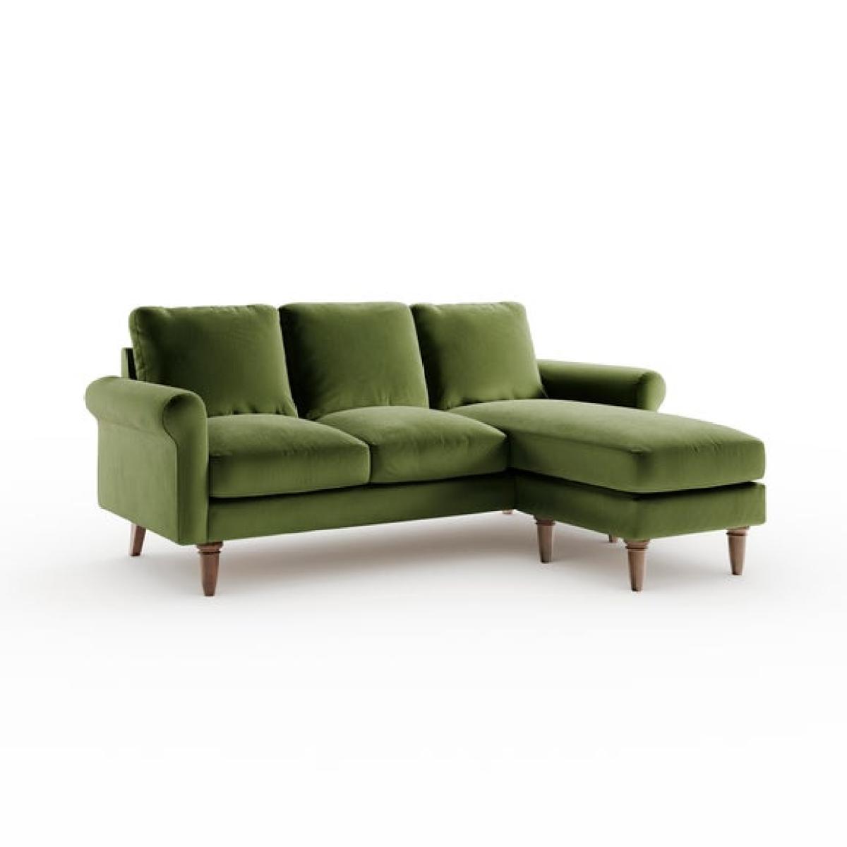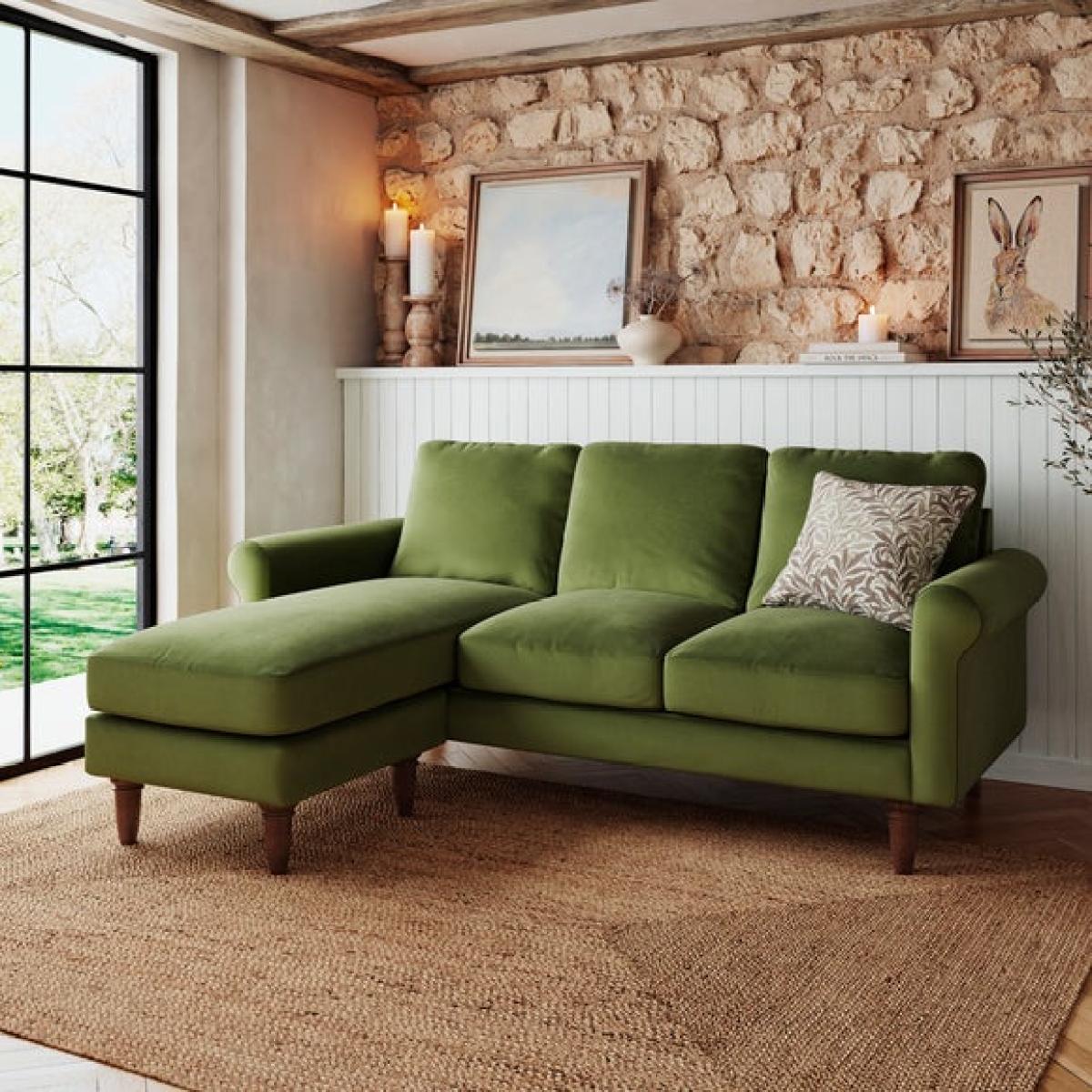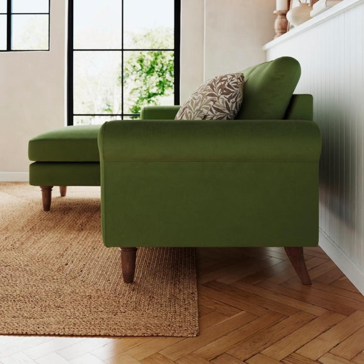 * Compact corner sofa * Comfortable chaise * Olive green velvet * Space saving solution Designed for smaller spaces, the Maeve Corner Chaise Sofa offers both comfort and style without compromising on practicality. Its timeless scroll arm design and soft-touch velvet upholstery create a cosy yet elegant look, while the rich olive green colour complements a range of interiors. The sturdy wooden frame provides durability, ensuring long-lasting support, while the removable cushions make maintenance effortless. With its compact shape and invitingly soft foam and fibre filled seat, it’s perfect for relaxing after a long day. A stylish and versatile addition to any living space.
