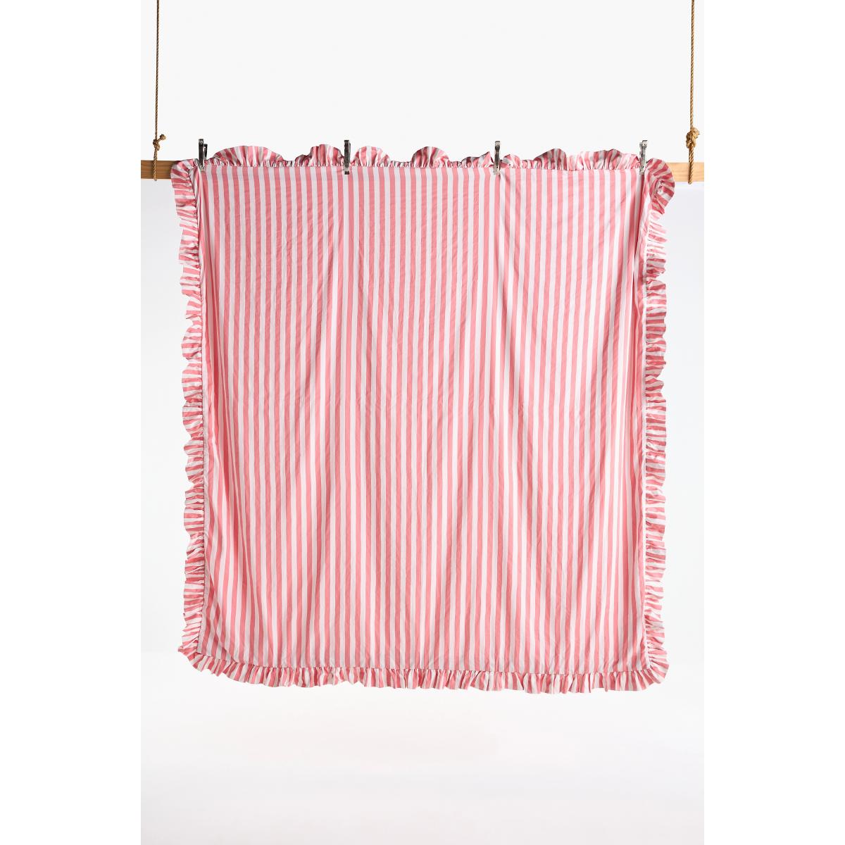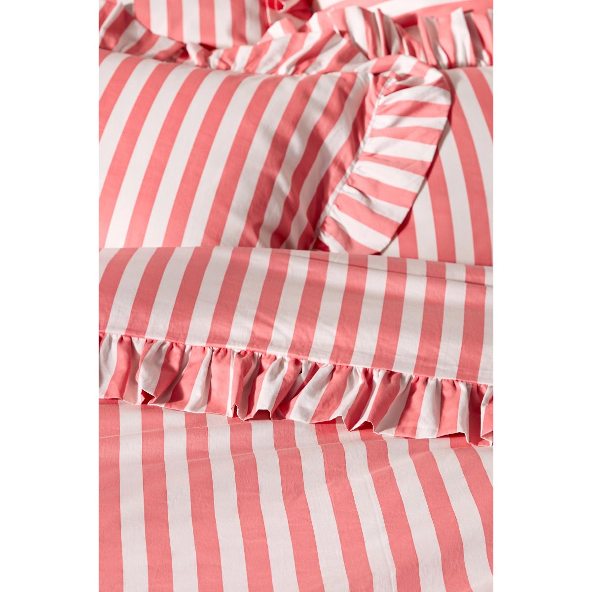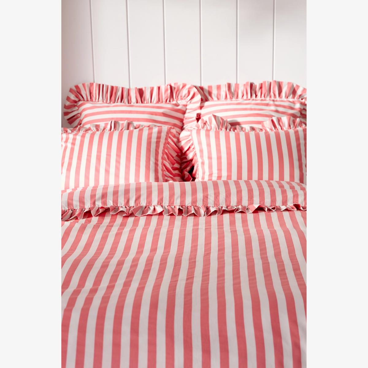 I love this duvet cover for its playful yet timeless stripe design, which adds a fresh, summery vibe to any bedroom. The ruffle detail offers a charming touch that softens the look, making it perfect for relaxed, casual interiors or a more eclectic space. It works well in coastal or shabby chic schemes but can also be styled effortlessly in modern interiors by pairing it with neutral or pastel bedding layers. Practical styling tips include balancing it with solid colour accessories to avoid overwhelming the space and layering with textured cushions for added visual interest. Ultimately, this cover's bright stripes bring a cheerful, inviting feel to any bedroom.
