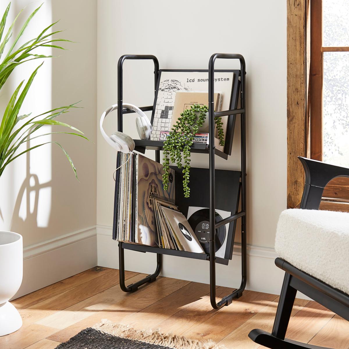 I love this black vinyl storage tower for its sleek, understated look that can add a contemporary edge to various interiors. It works particularly well in minimalist or industrial spaces, offering practicality without compromising style. To style it effectively, consider arranging your magazines or vinyls by colour or theme to create a visually appealing display. It’s also worth leaving some space between items to avoid a cluttered appearance and to keep the pieces feeling curated. This piece is versatile enough to sit alongside vintage furniture, modern shelving units, or even in a casual entertainment zone, making it a functional yet stylish addition.
