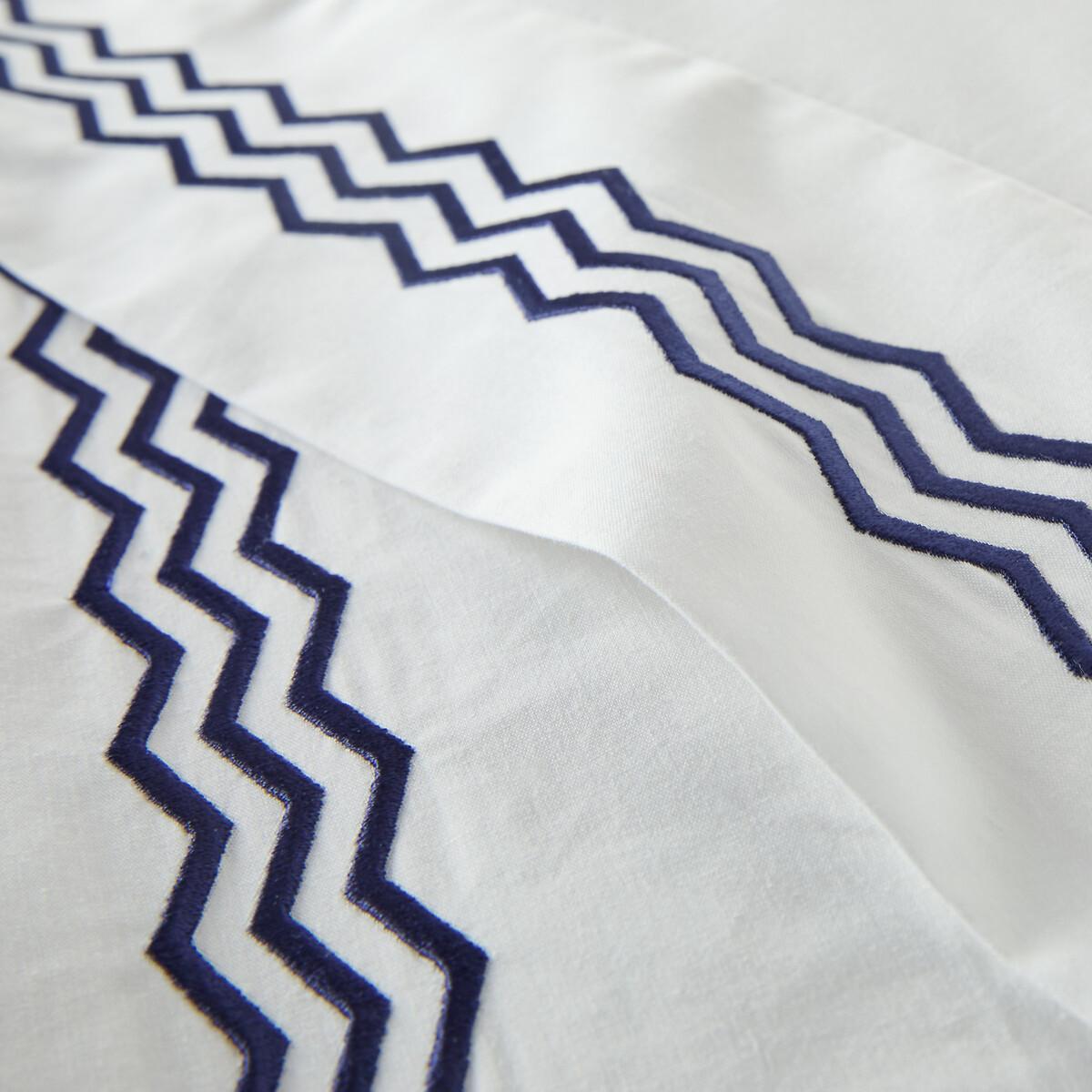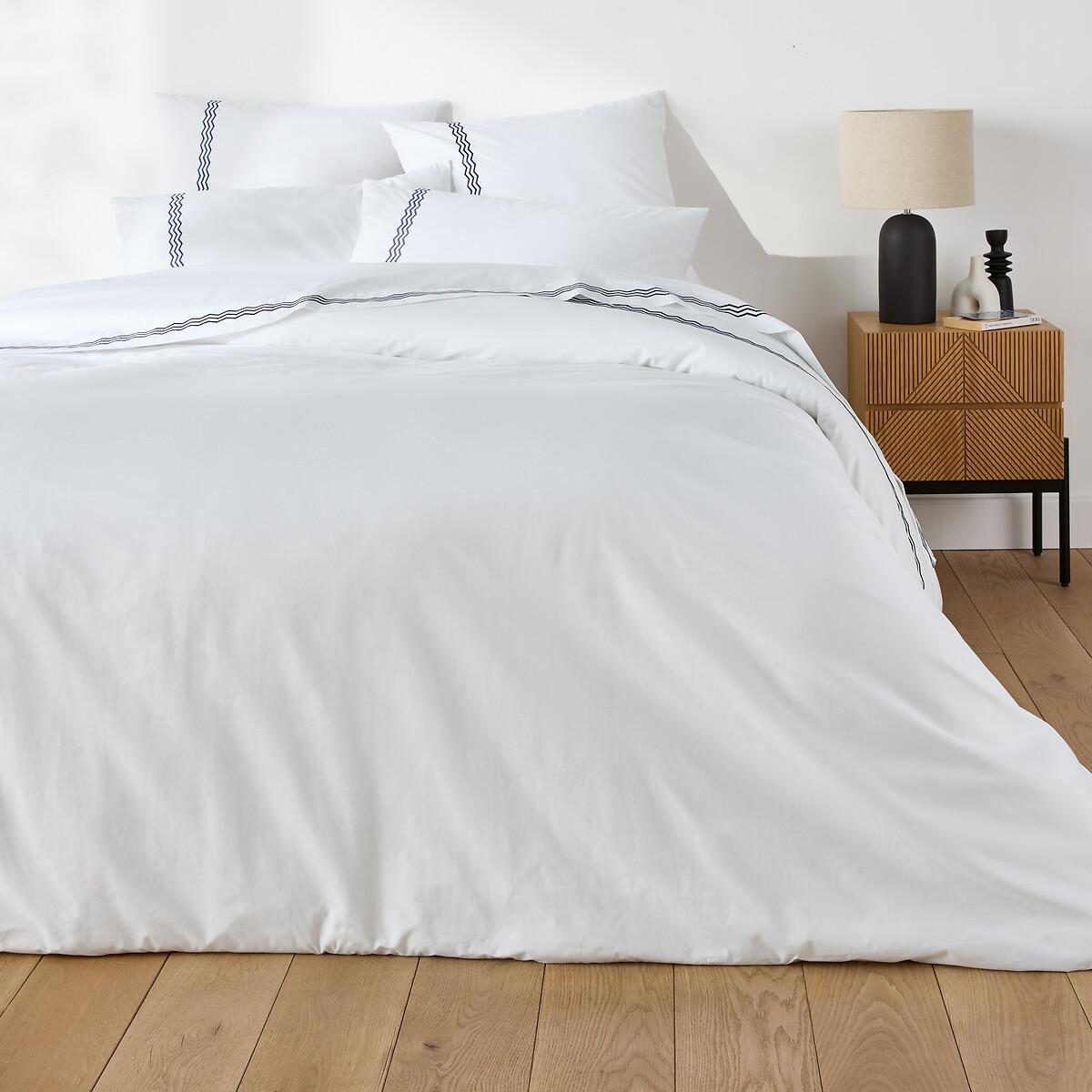 Cotton percale and contrasting geometric embroidery, in a chic and contemporary universe... Magda is a creation of our designers at La Redoute Intérieurs. The cotton percale offers a pleasant feeling of freshness and lightness. Its tight weave makes it particularly soft for premium comfort. A matte and smooth material that will soften over time. Product Details • 100% cotton, 115g/m2 • Cotton percale • 200 thread count: The higher the thread count, the higher the quality of the weave • Contrasting embroidery • Straight buttoned hem Care Advice • Machine washable at 60°C • By washing your laundry at 40°C instead of 60°C, you limit energy consumption. Dimensions • 140 x 200cm: Single • 200 x 200cm: Double • 240 x 220cm: King • 260 x 240cm: King • OEKO-TEX® Standard 100. Standard 100 certification by OEKO-TEX® tests textile products for harmful substances via an independent, international label.