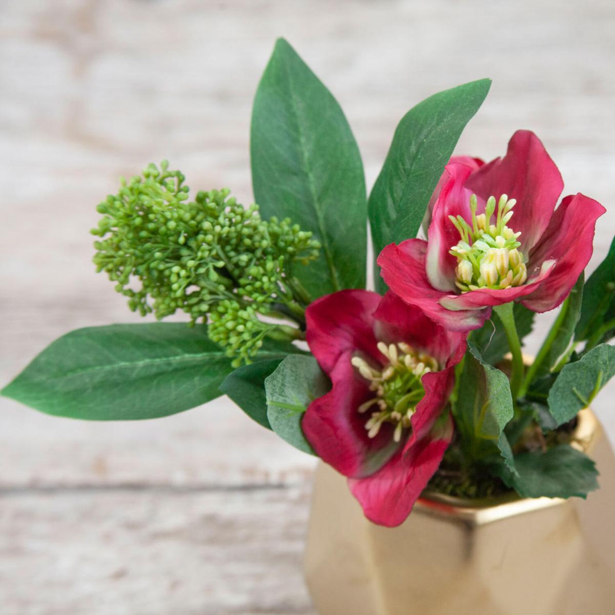 Magenta hellebores, with skimmia berries in a ceramic vessel by Peony - Festive Red and Greens